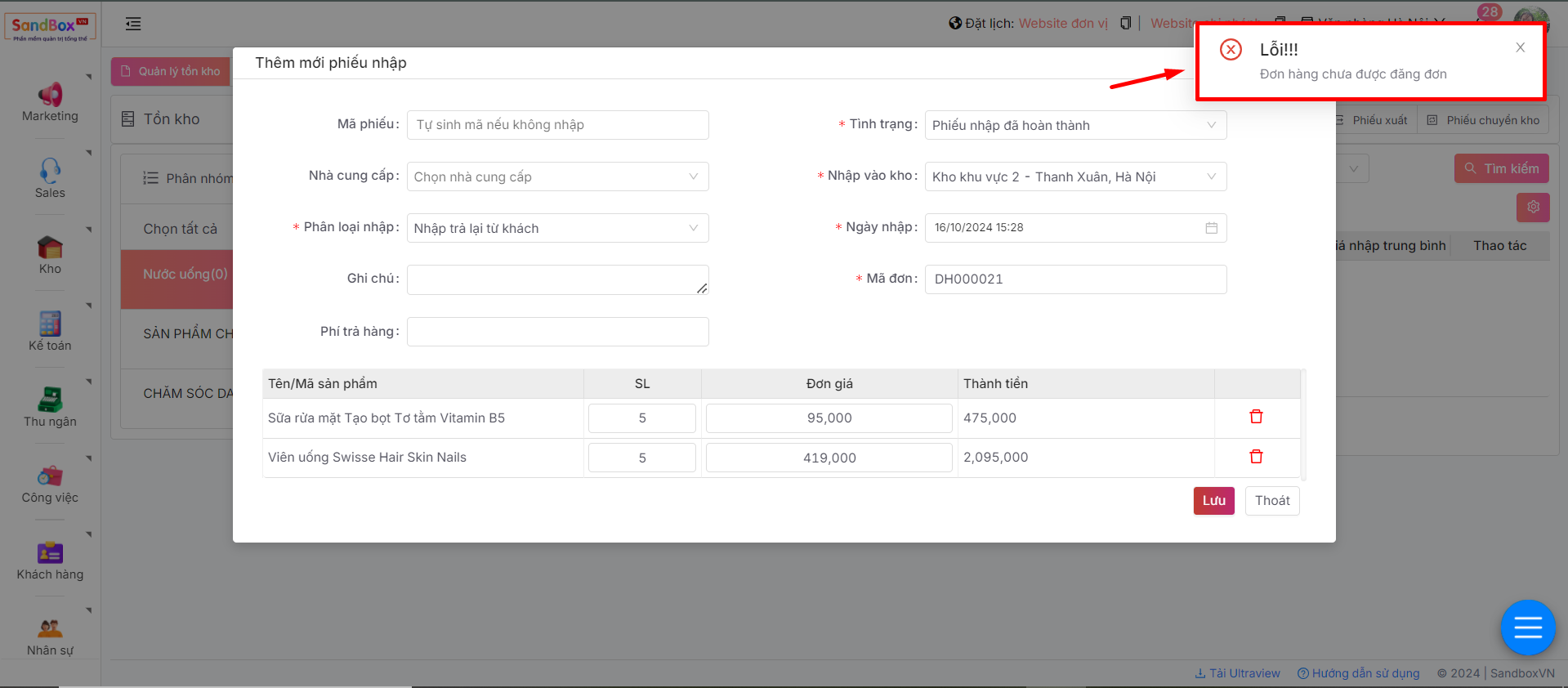 **Lưu ý**: Chỉ có thể thực hiện tạo phiếu nhập hàng trả lại từ khách với những đơn hàng ở trạng thái đăng đơn. Trường hợp chọn đơn chưa đăng, hệ thống sẽ hiển thị thông báo lỗi