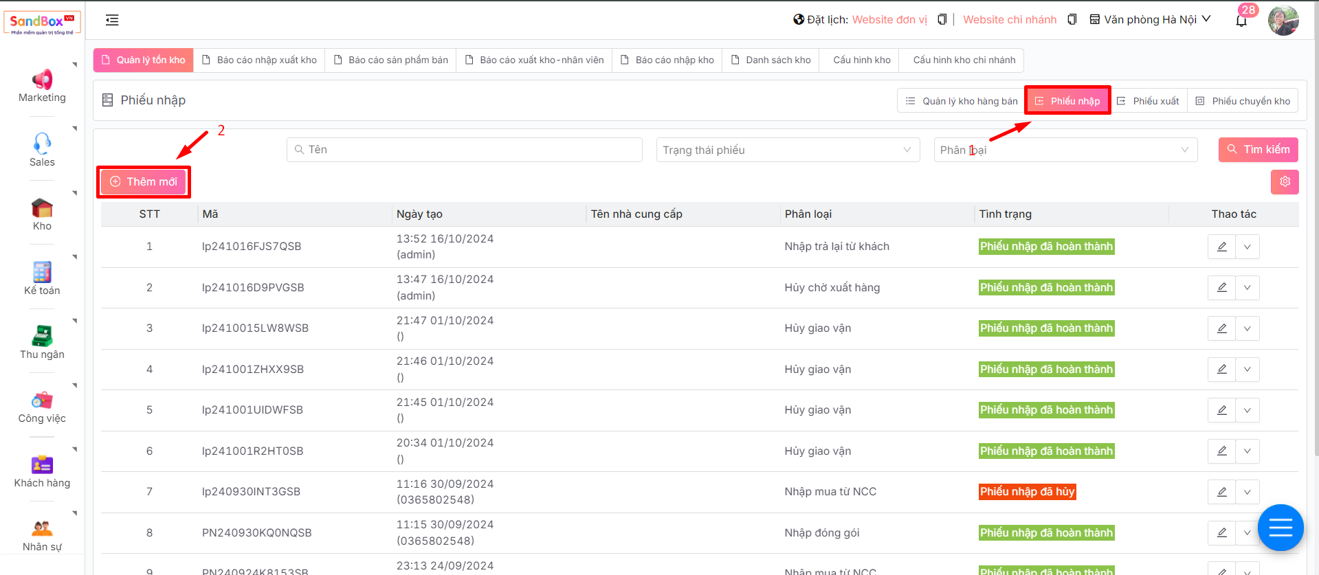 * Hoặc tìm kiếm phiếu nhập theo bộ lọc "Trạng thái phiếu nhập" hoặc "Phân loại":