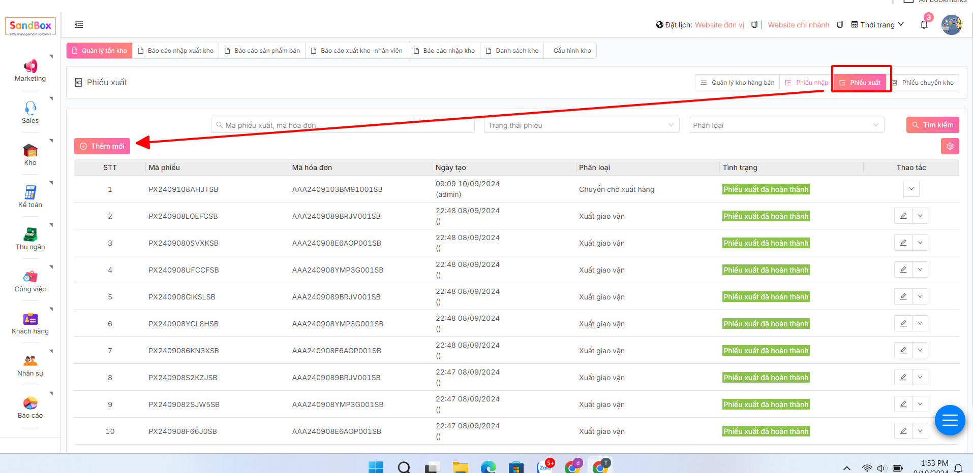 Tại trang Tồn kho, ấn nút Phiếu xuất -> Thêm mới.