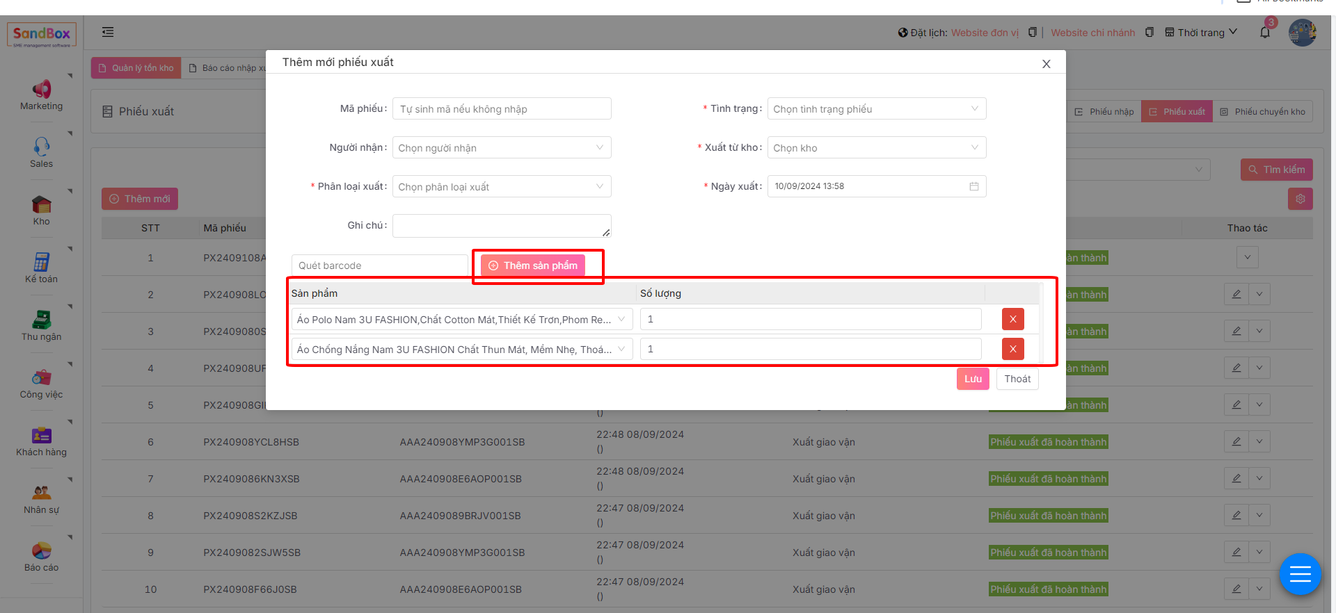 Chọn sản phẩm muốn xuất kho trong danh sách sản phẩm và nhập số lượng sẽ xuất(bắt buộc)
