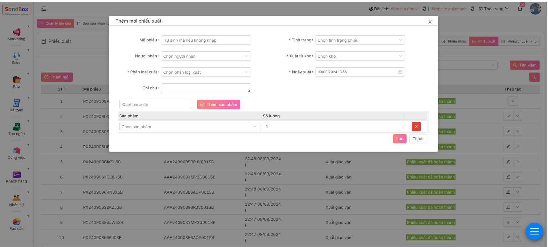 Màn hình hiển thị form Thêm mới phiếu xuất