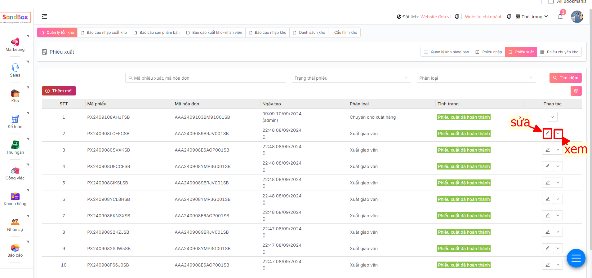 Ngoài ra, để thuận tiện quản lý và kiểm soát, bạn có thể tìm kiếm phiếu xuất theo Mã phiếu xuất,mã hóa đơn, Trạng thái hoặc Phân loại để lọc kết quả.