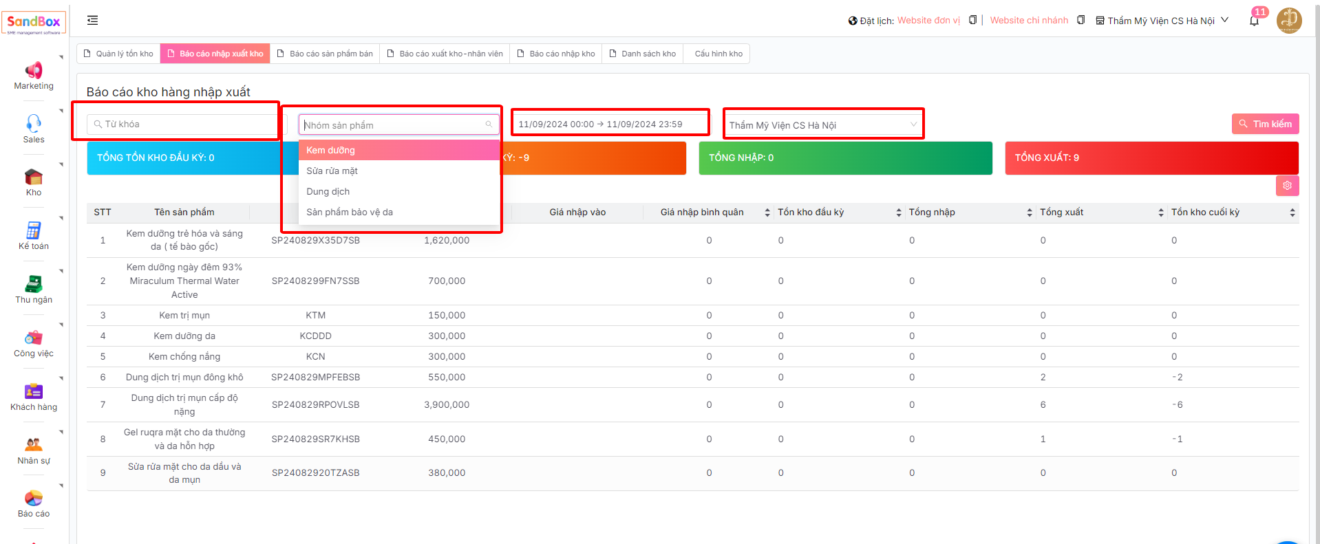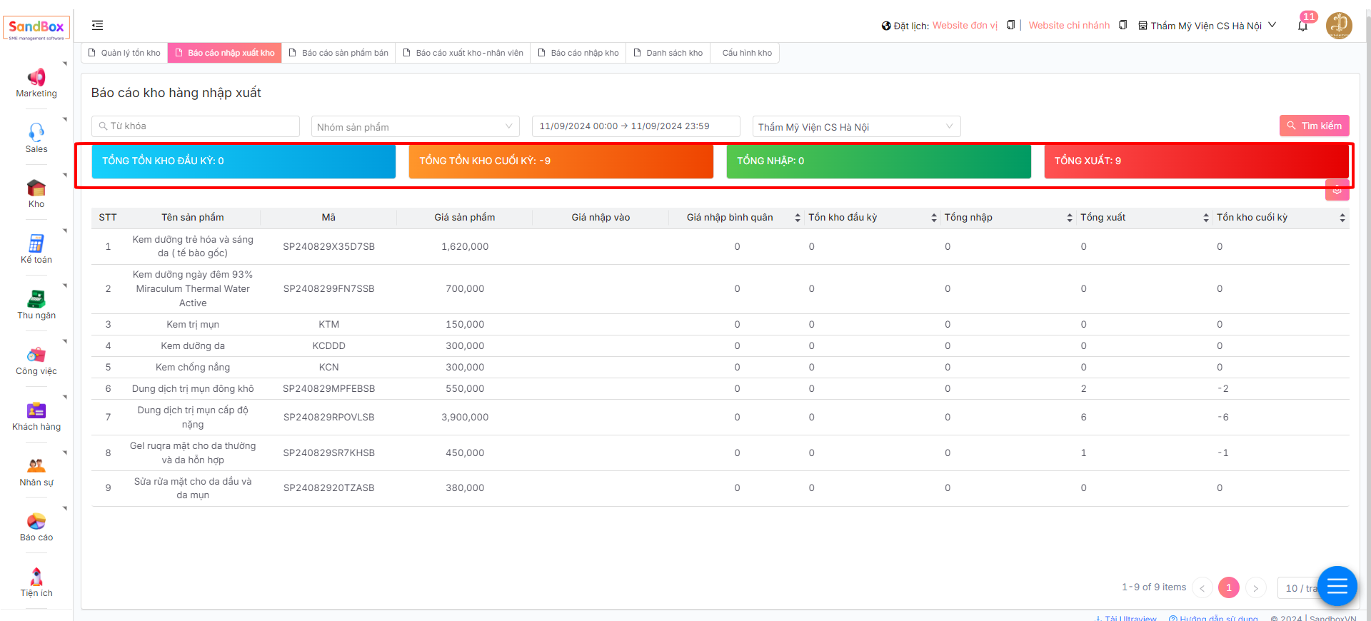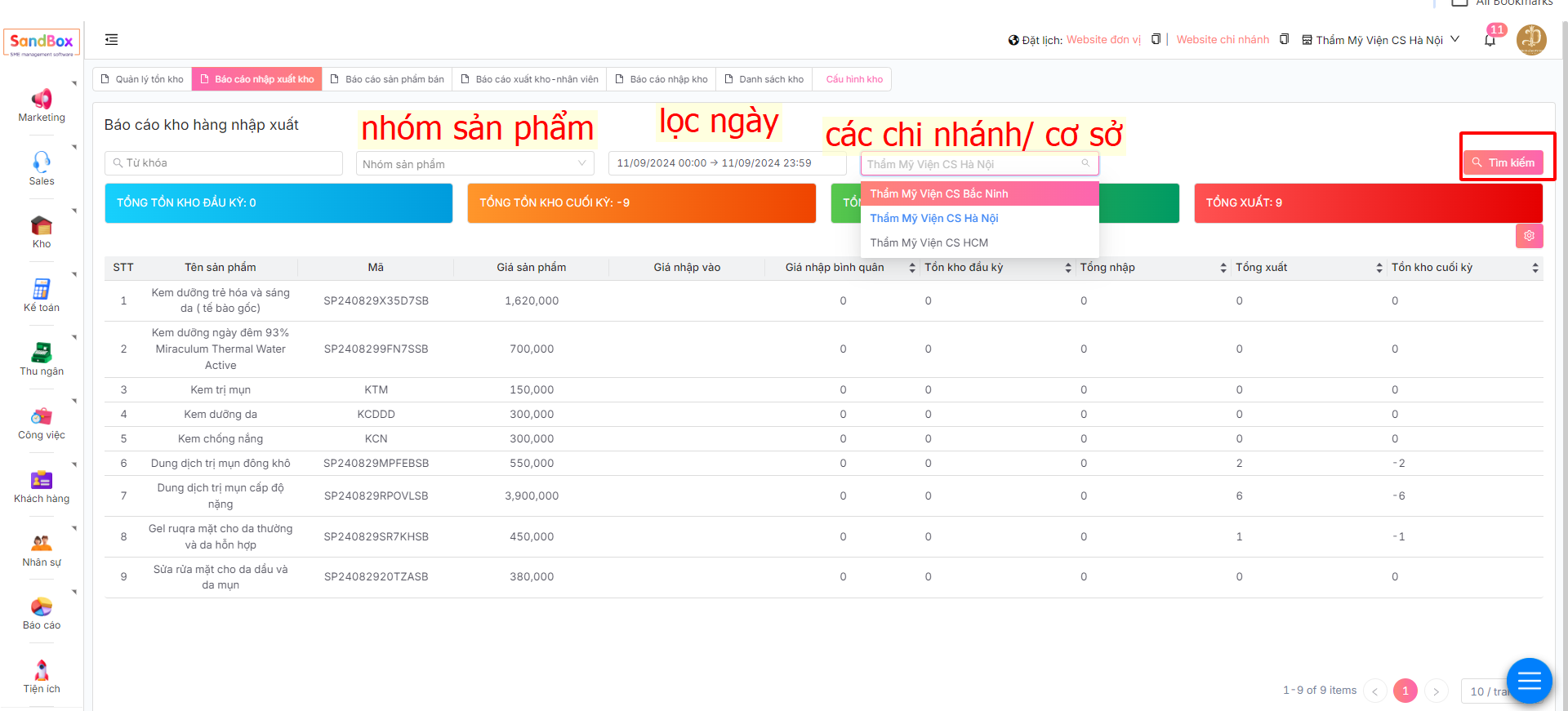 Chọn menu Kho => Quản lí tồn kho => Báo cáo nhập xuất kho