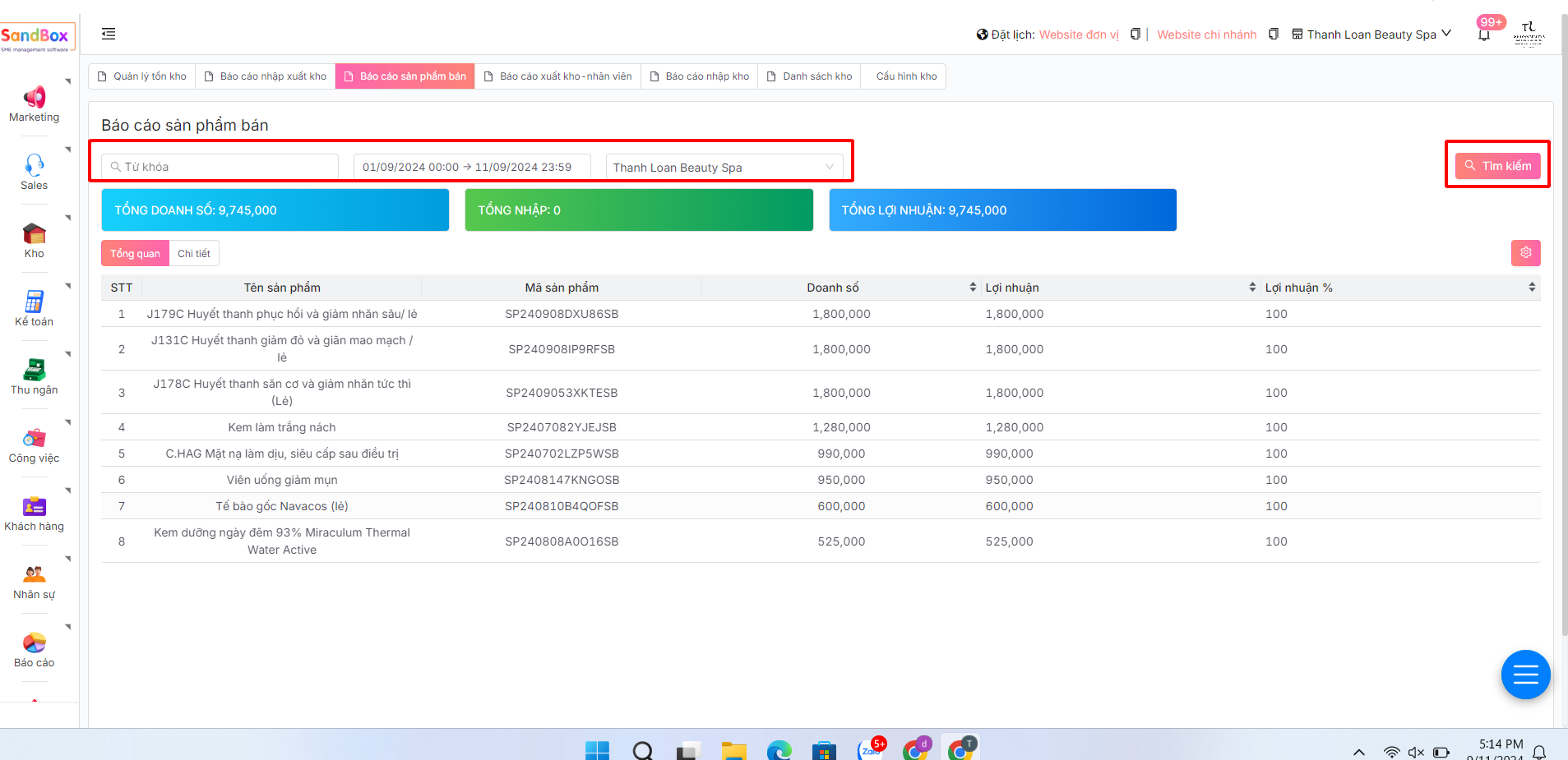 Có thể tìm kiếm từ khoá, lọc thời gian, lựa chọn chi nhánh xem => sau đó ấn T**ìm kiếm**&#x20;