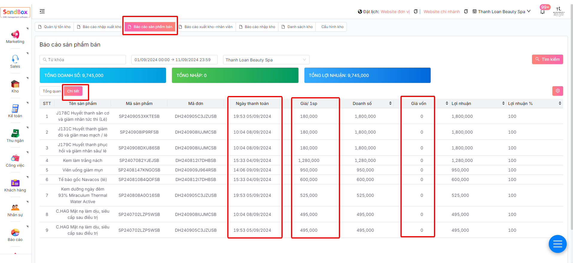 Ở phần chi tiết xem được chi tiết hơn về: Ngày thanh toán, Giá/1sp, Giá vốn