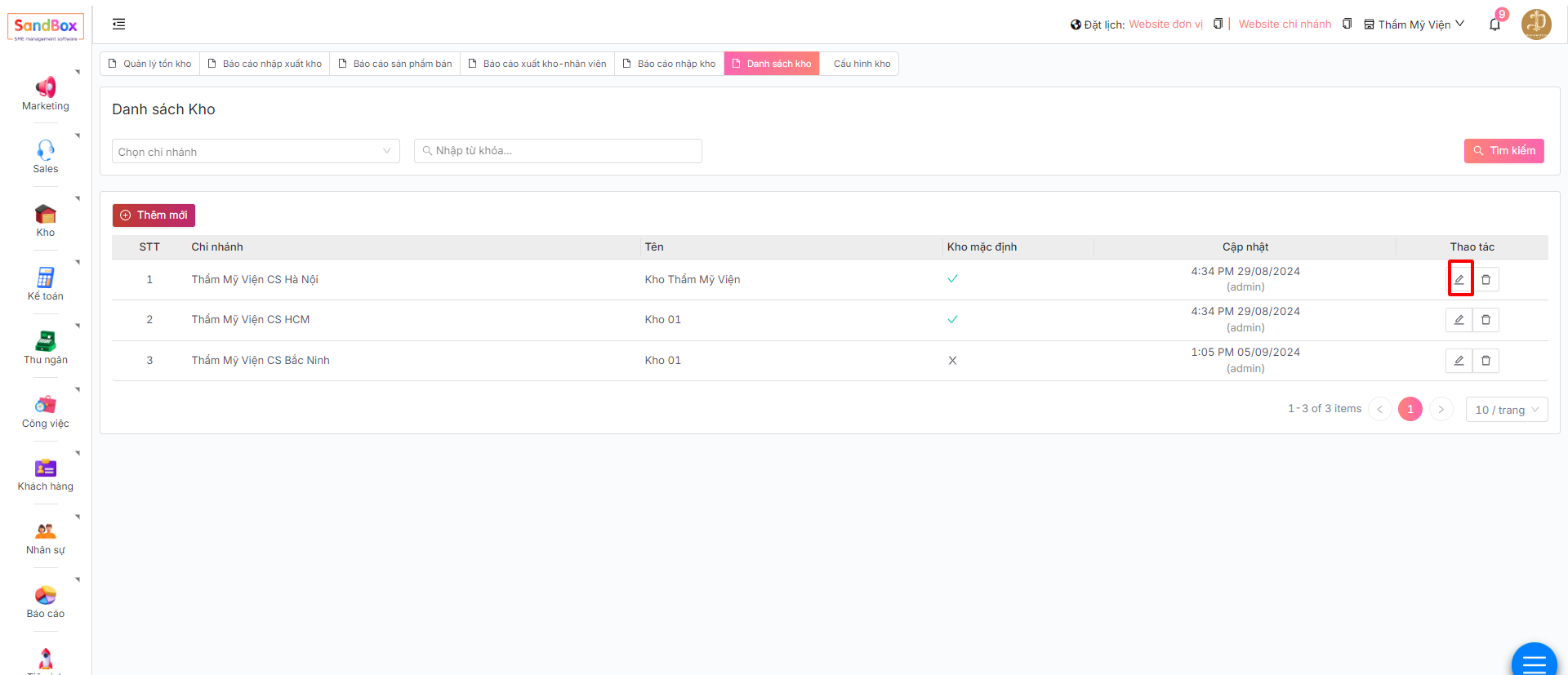 3. Để sửa thông tin kho, chọn nút **Sửa** tại bản ghi kho tương ứng