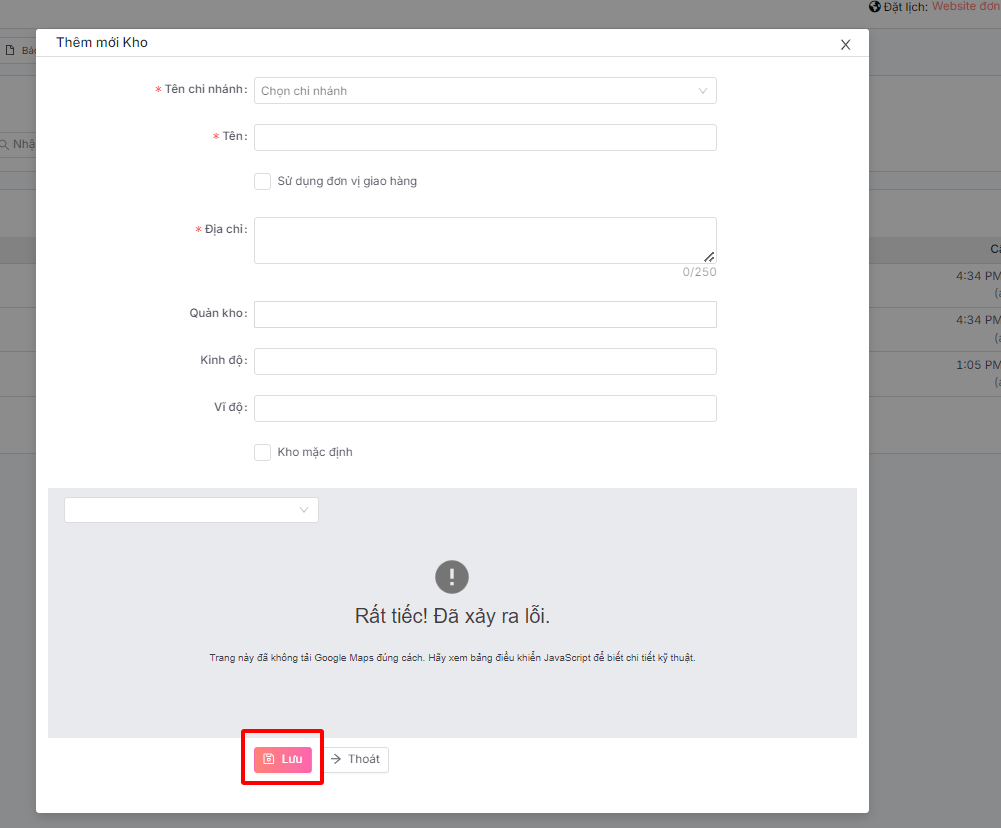 * Tên chi nhánh: Chọn tên chi nhánh cho kho muốn tạo