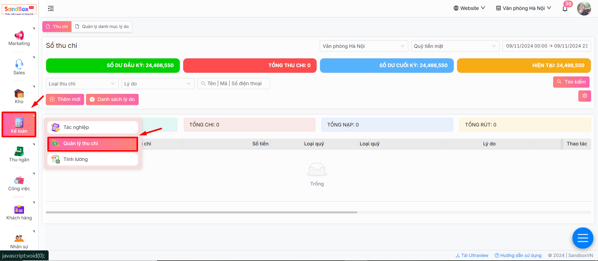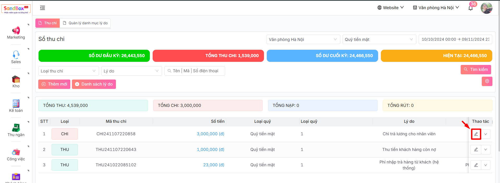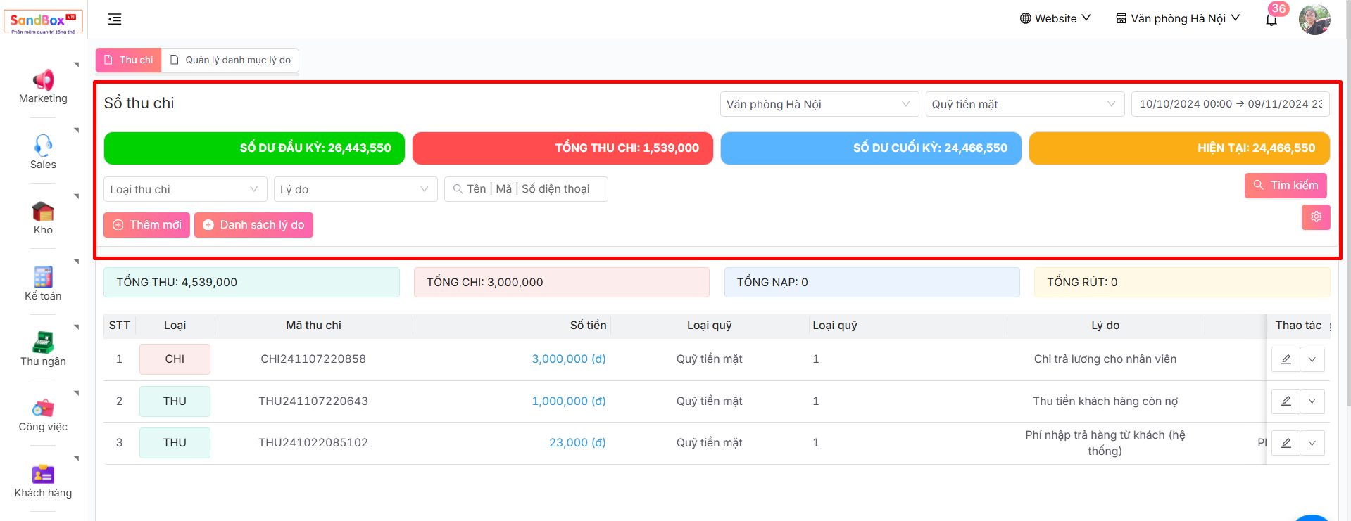 -> Màn hình hiển thị sổ thu chi, tai đây bạn có thể thấy tất cả thông số và dữ liệu liên quan đến thu chi của doanh nghiệp trong hệ thống.