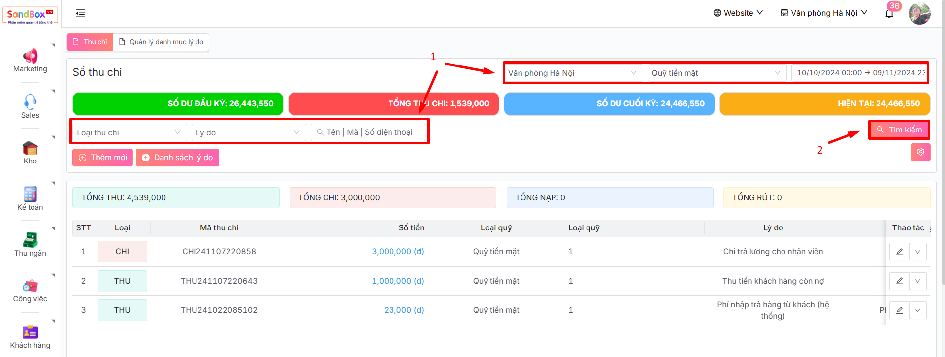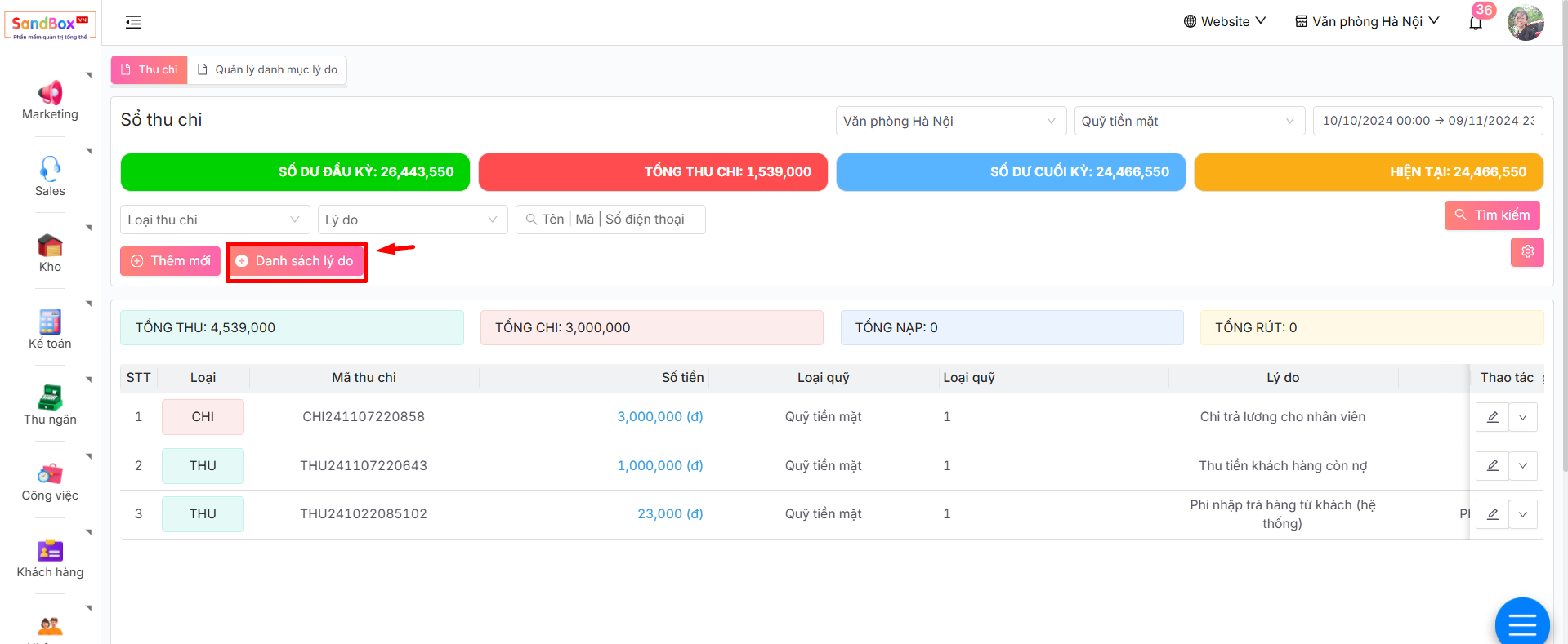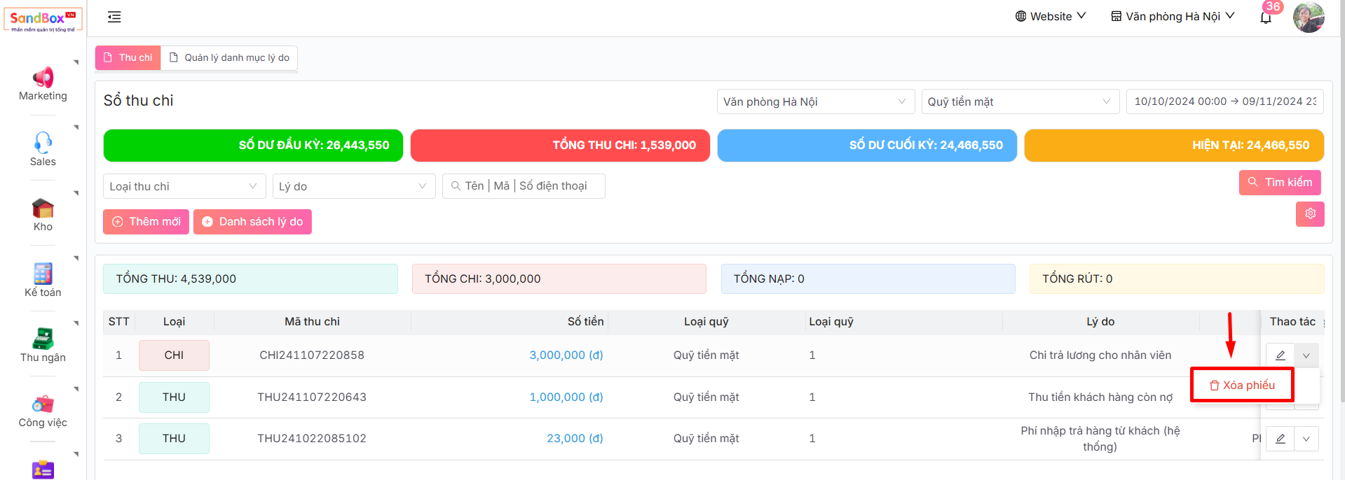 -> Màn hình hiển thị sổ thu chi, tai đây bạn có thể thấy tất cả thông số và dữ liệu liên quan đến thu chi của doanh nghiệp trong hệ thống.