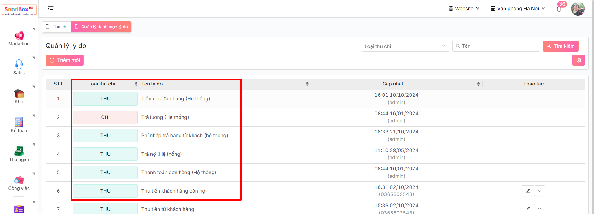 **Lưu ý:** Chỉ có thực hiện xóa đối với lý do thu chi tự thêm, không thể thao tác lý do thu chi mặc định của hệ thống