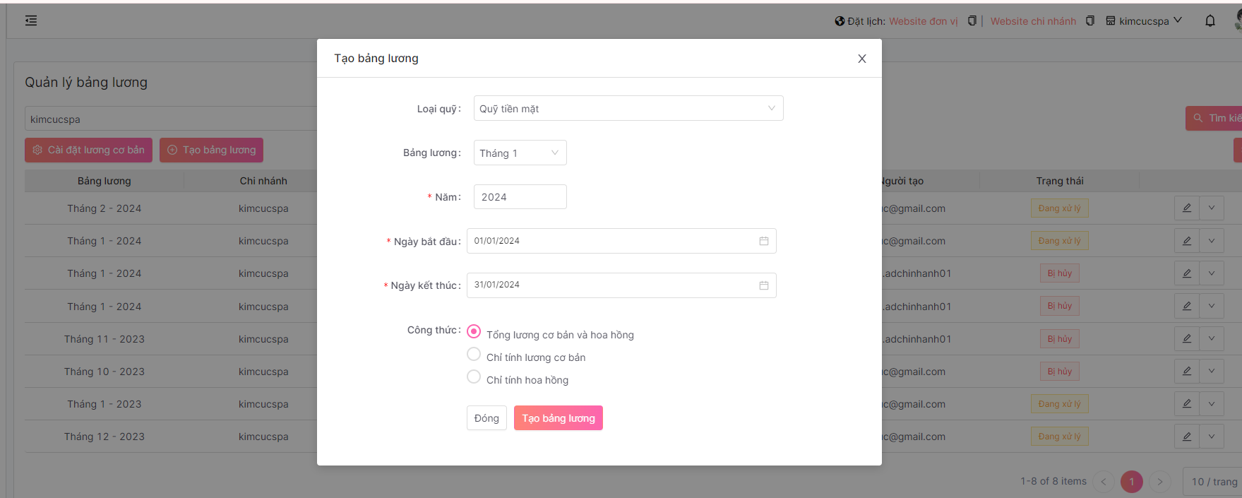 **Lưu ý: không thể tạo bảng lương mới có cùng Tháng/Năm với một bảng lương đã tồn tại (ngoại trừ trường hợp bảng lương đó đã bị hủy, trong trường hợp này thì cho phép trùng)**