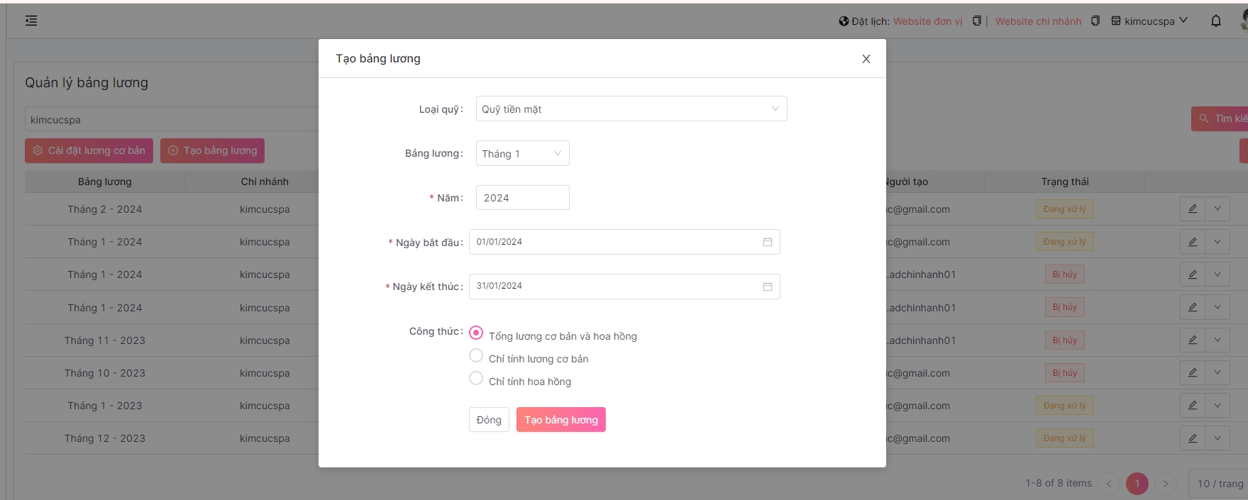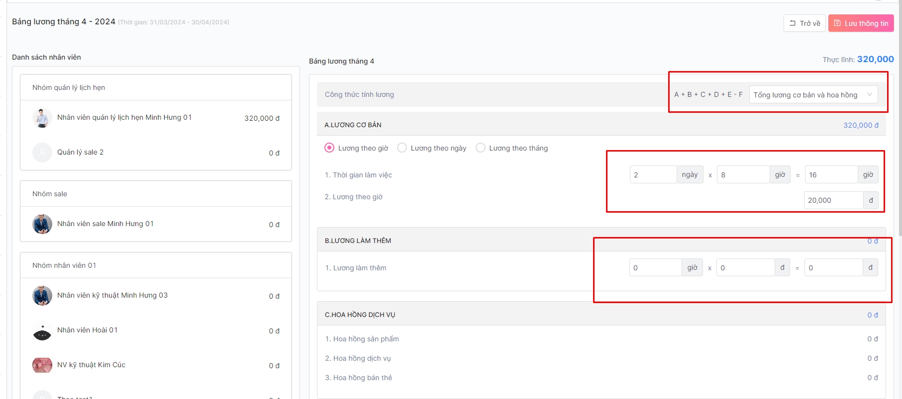 Sau khi bạn nhập các chỉ số lương cho nhân viên, hệ thống sẽ tự động tính toán và hiển thị số tiền "Thực lĩnh"