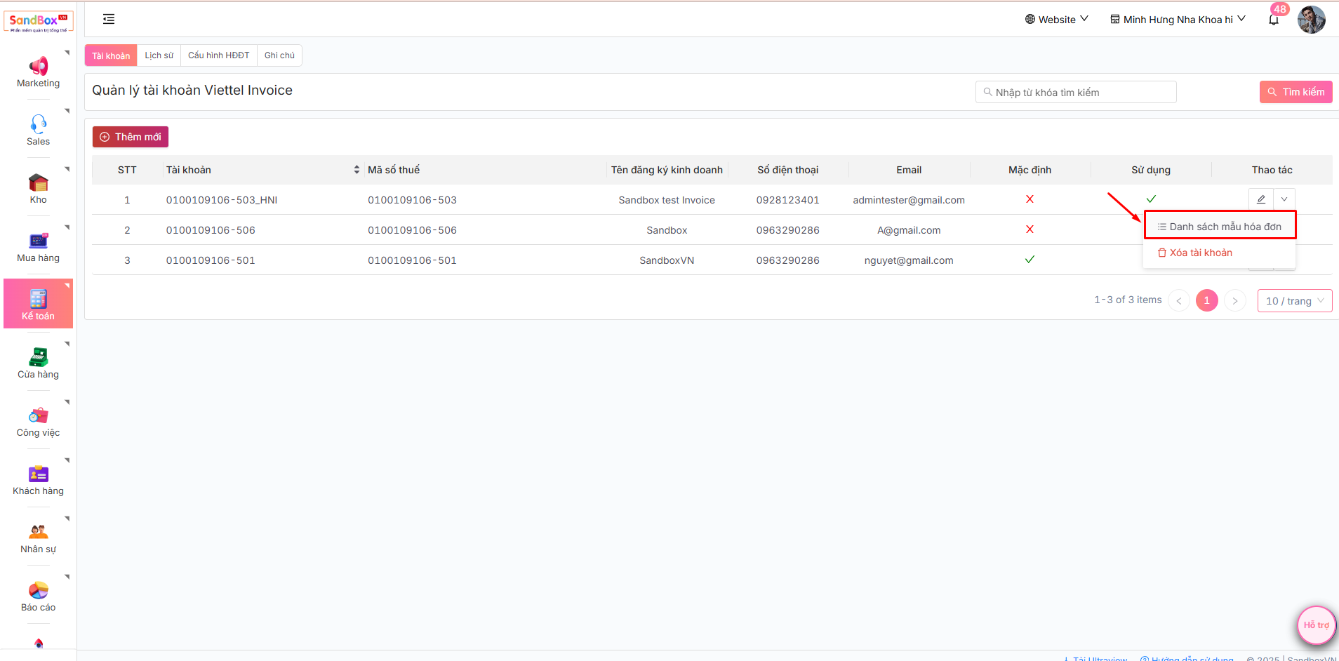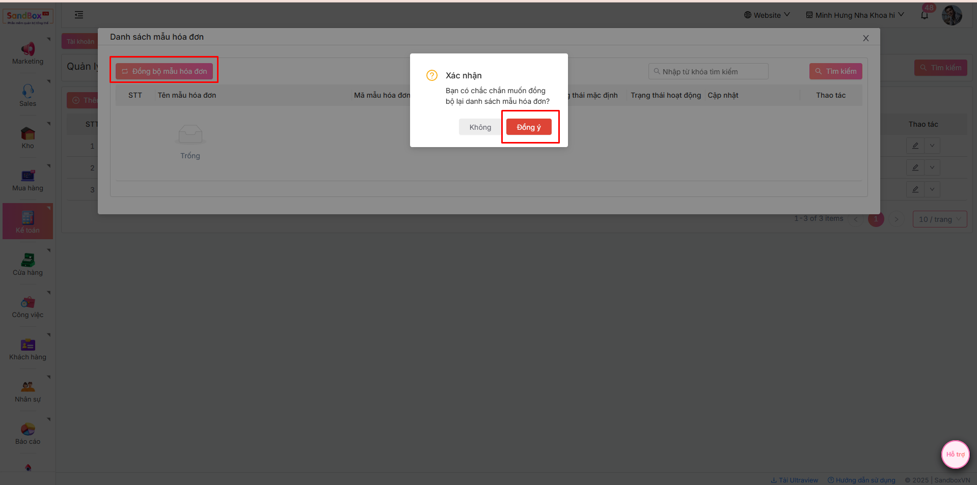 \- Chọn ![](https://docs.sandbox.com.vn/~gitbook/image?url=https%3A%2F%2F46536393-files.gitbook.io%2F%7E%2Ffiles%2Fv0%2Fb%2Fgitbook-x-prod.appspot.com%2Fo%2Fspaces%252FKnaMljuquxKOnflZEqLy%252Fuploads%252F5T4dvTTeoLaknbtC4rqj%252Fimage.png%3Falt%3Dmedia%26token%3Db7b601fd-a017-486a-8f6f-e02c1f2464c7\&width=300\&dpr=4\&quality=100\&sign=34972235\&sv=2) và ấn ![](https://docs.sandbox.com.vn/~gitbook/image?url=https%3A%2F%2F46536393-files.gitbook.io%2F%7E%2Ffiles%2Fv0%2Fb%2Fgitbook-x-prod.appspot.com%2Fo%2Fspaces%252FKnaMljuquxKOnflZEqLy%252Fuploads%252FZJFO1fUkLaQHAHJPMwLx%252Fimage.png%3Falt%3Dmedia%26token%3D3b35bbd1-2684-46bb-ae6a-850a70456553\&width=300\&dpr=4\&quality=100\&sign=ca185214\&sv=2) để đồng bộ và sử dụng mẫu hóa đơn: