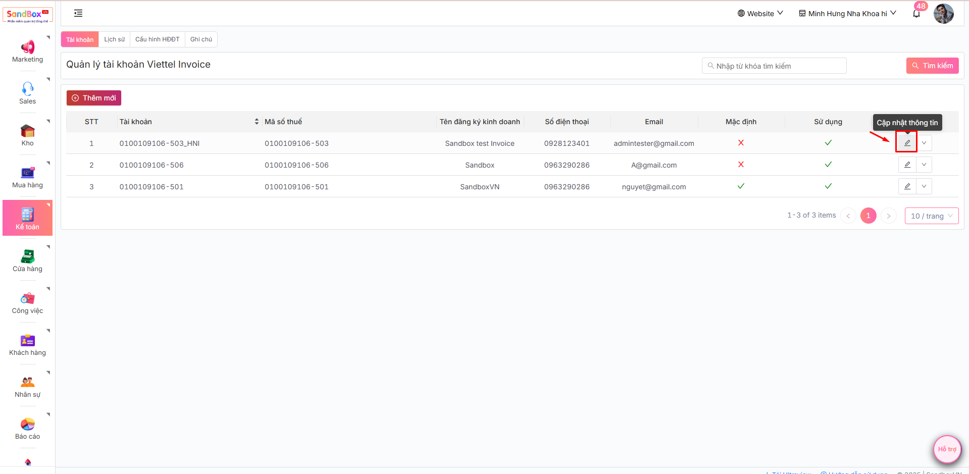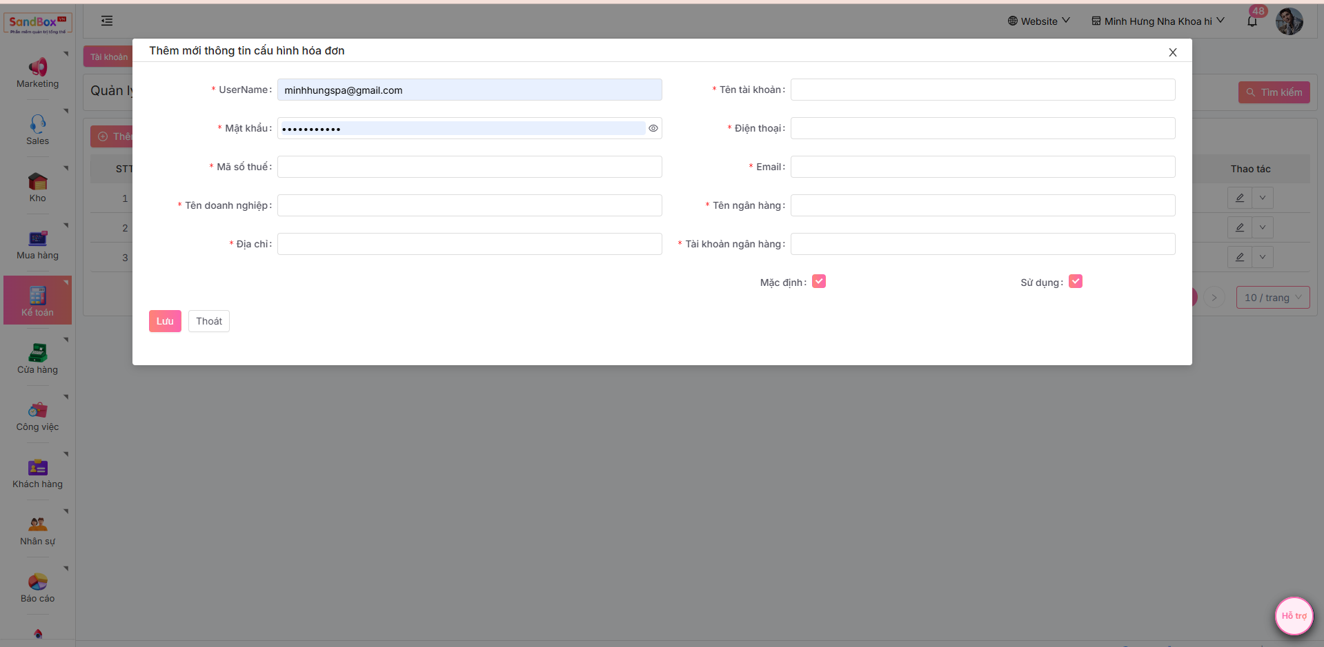 * Chọn **Thêm mới** để điền thông tin thêm tài khoản **Viettel Invoice** và ấn **lưu** thông tin: