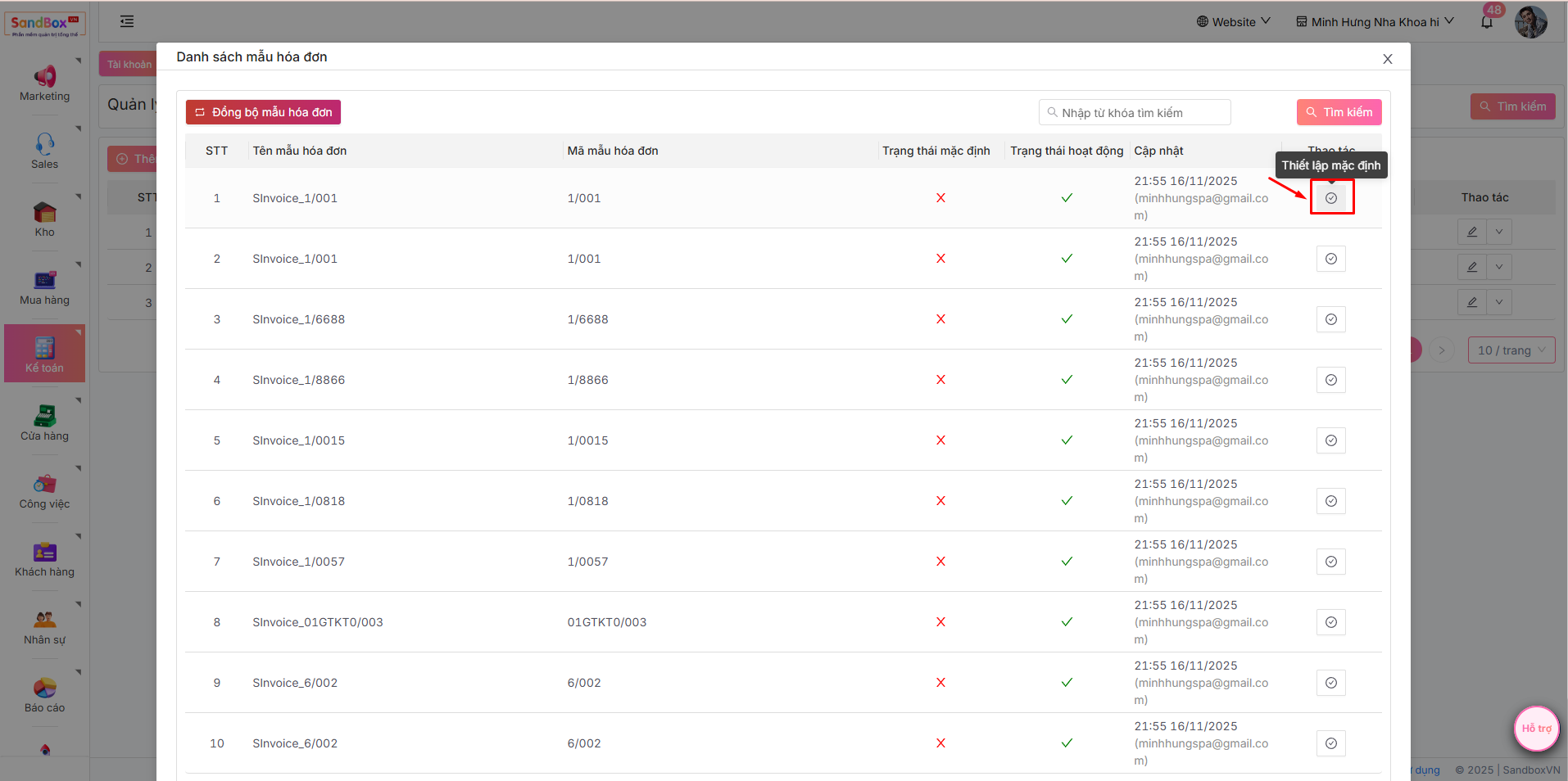 \- Để chọn thiết lập mặc định mẫu hóa đơn đó, chọn ![](https://docs.sandbox.com.vn/~gitbook/image?url=https%3A%2F%2F46536393-files.gitbook.io%2F%7E%2Ffiles%2Fv0%2Fb%2Fgitbook-x-prod.appspot.com%2Fo%2Fspaces%252FKnaMljuquxKOnflZEqLy%252Fuploads%252FgGwjA0jKqH0YZeV5Sihm%252Fimage.png%3Falt%3Dmedia%26token%3D0b3d4e3c-5935-424e-87cc-d64b0858e9e0\&width=300\&dpr=4\&quality=100\&sign=fd2b6a7d\&sv=2) tại cột thao tác: