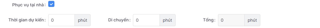 Phục vụ tại nhà: Tích vào nếu khách có nhu cầu thực hiện dịch vụ tận nơi. Sau khi chọn có thêm trường thời gian di chuyển của nhân viên để theo dõi và kiểm soát lịch hẹn.