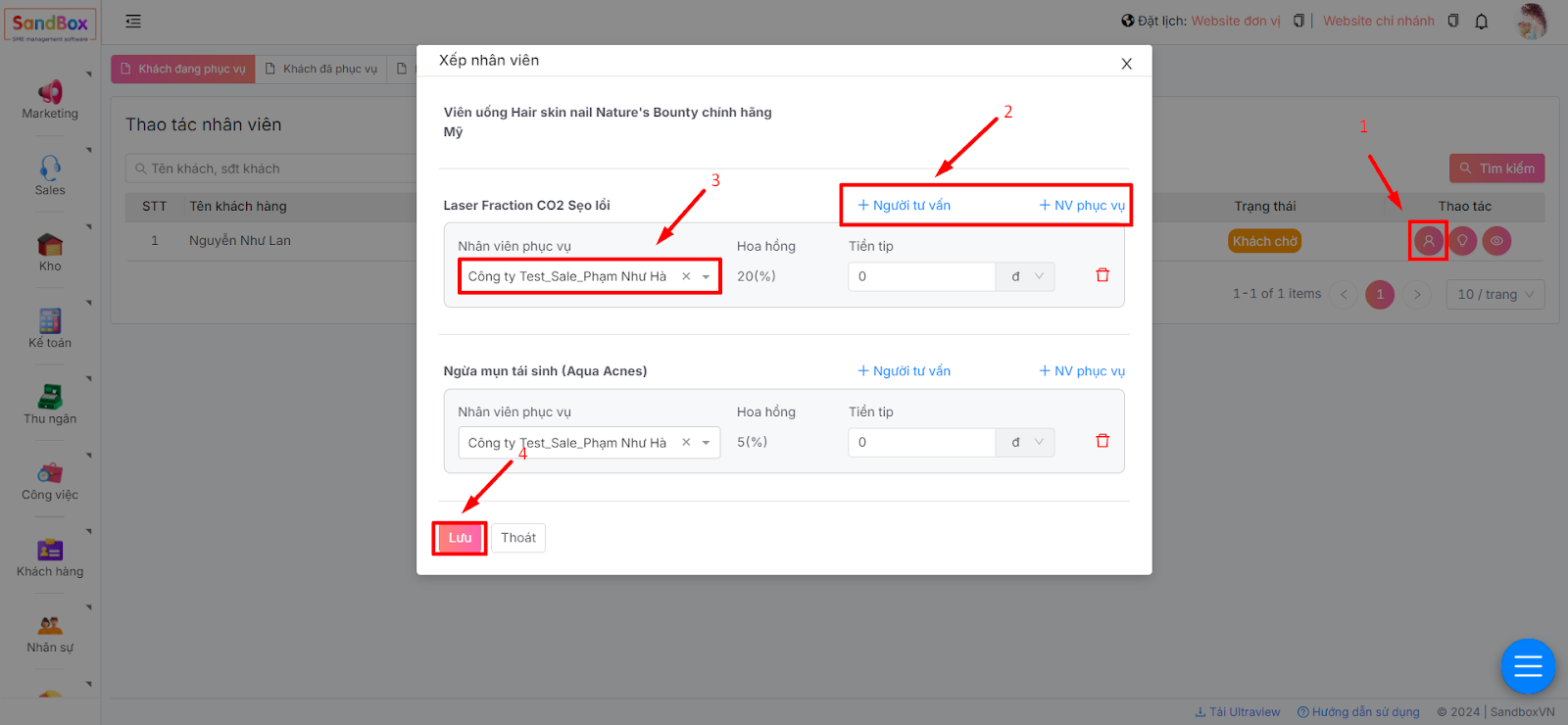 Chọn mục Người tư vấn, NV phục vụ ứng với từng dịch vụ → Chọn nhân viên phục vụ cần xếp → chọn Lưu
