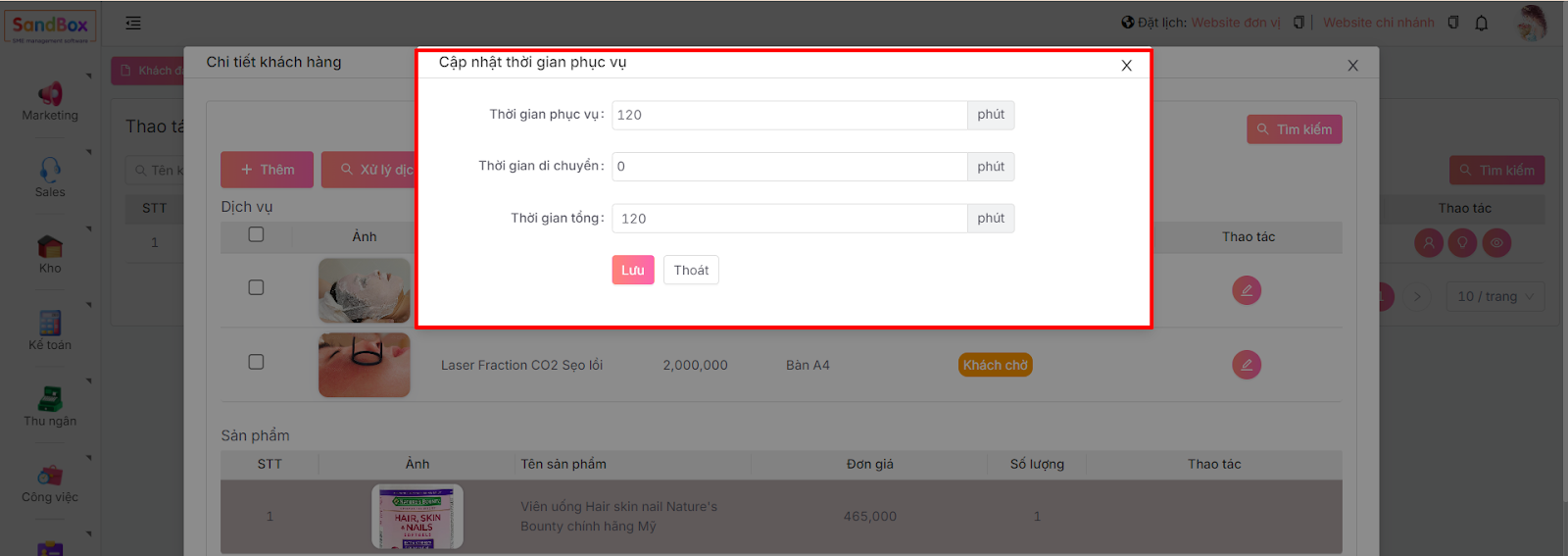 + Chọn mục Sửa thời gian phục vụ để chỉnh sửa đúng với thời gian thực tế phục vụ.