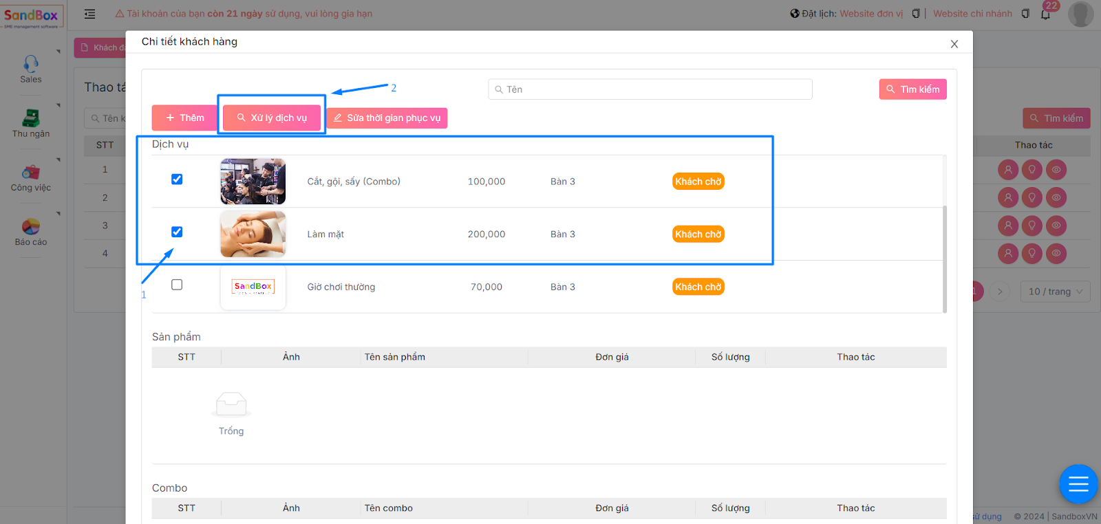 + Hệ thống hiển thị chi tiết các dịch vụ → Tích vào các dịch vụ cần xử lí → Chọn mục Xử lý dịch vụ
