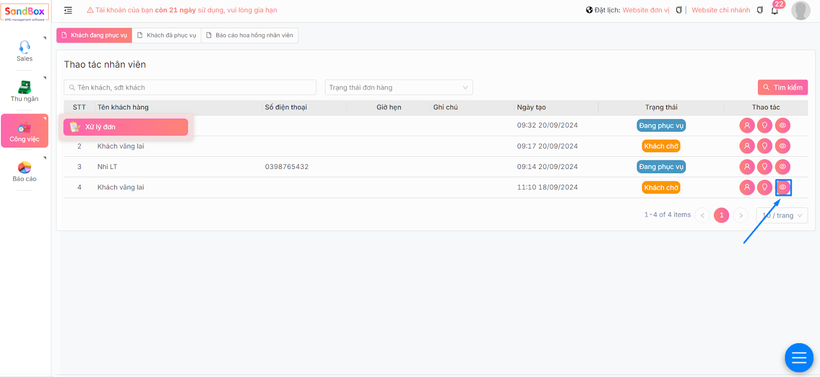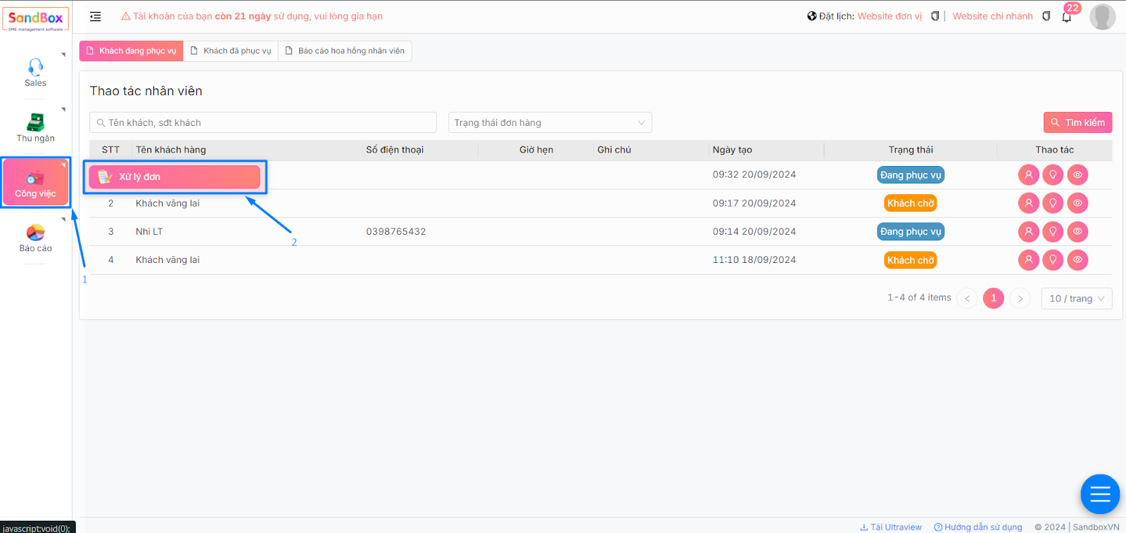 Đăng nhập tài khoản nhân viên, trên thanh menu chọn mục Công việc → chọn Xử lý đơn