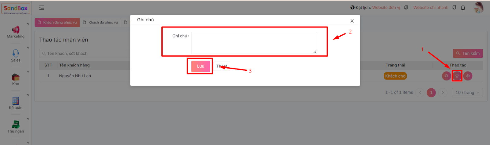 tại cột Thao tác, nhập thông tin ghi chú tại popup Ghi chú sau đó bấm chọn Lưu
