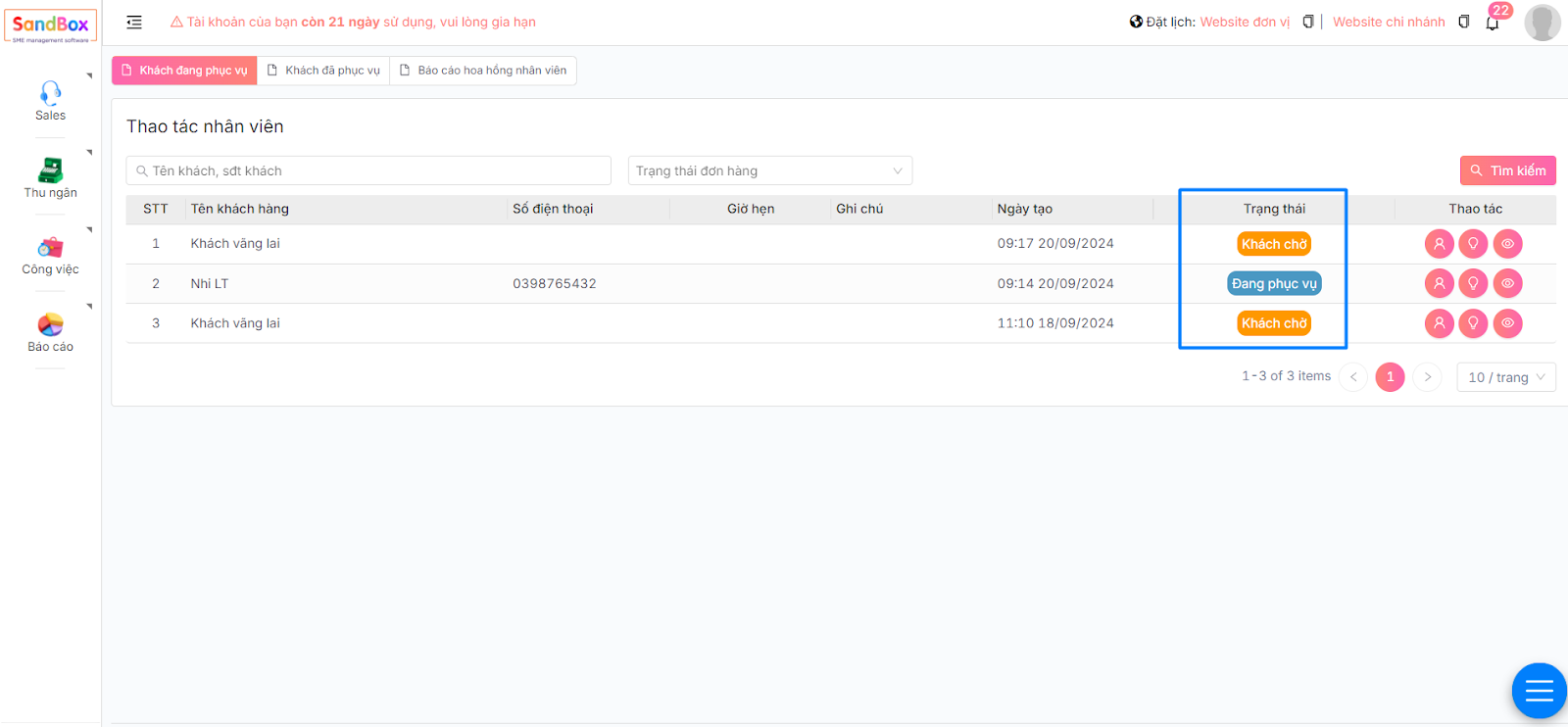 Nhân viên có thể theo dõi trạng thái của từng khách hàng trong giao diện Thao tác nhân viên, tại cột Trạng thái