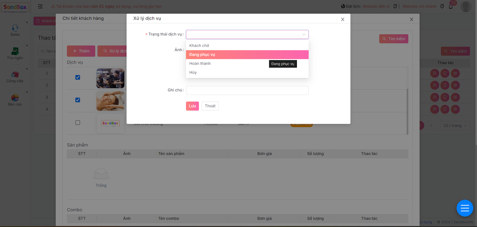 → Hệ thống hiển thị popup Xử lý dịch vụ → Chọn Trạng thái dịch vụ → Chọn Lưu (có thể tải ảnh hoặc thêm ghi chú khách hàng nếu cần)