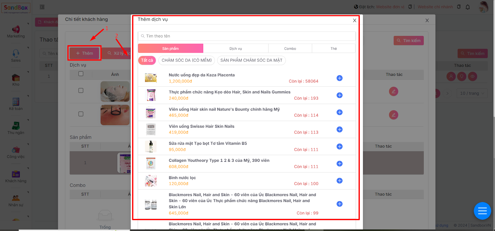 + Chọn mục Thêm để thêm các sản phẩm, dịch vụ, combo, thẻ theo nhu cầu của khách hàng (các sản phẩm, dịch vụ, combo, thẻ được thêm tại đây sẽ được hiển thị tại màn Thu ngân giúp nhân viên thu ngân nắm bắt thông tin chính xác)