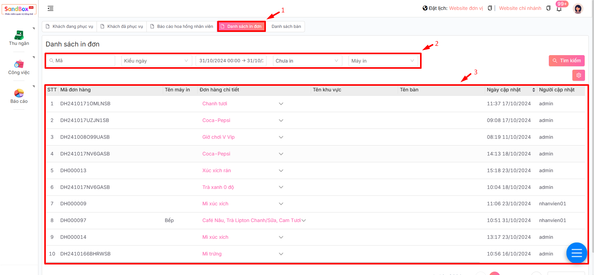 * Tại cột **Thao tác,** có thể tích chọn để xác nhận đã in đơn (1), chọn in đơn (2) để mở popup in hóa đơn và chọn biểu tượng thùng rác (3) để xóa mục in đơn khỏi danh sách in đơn