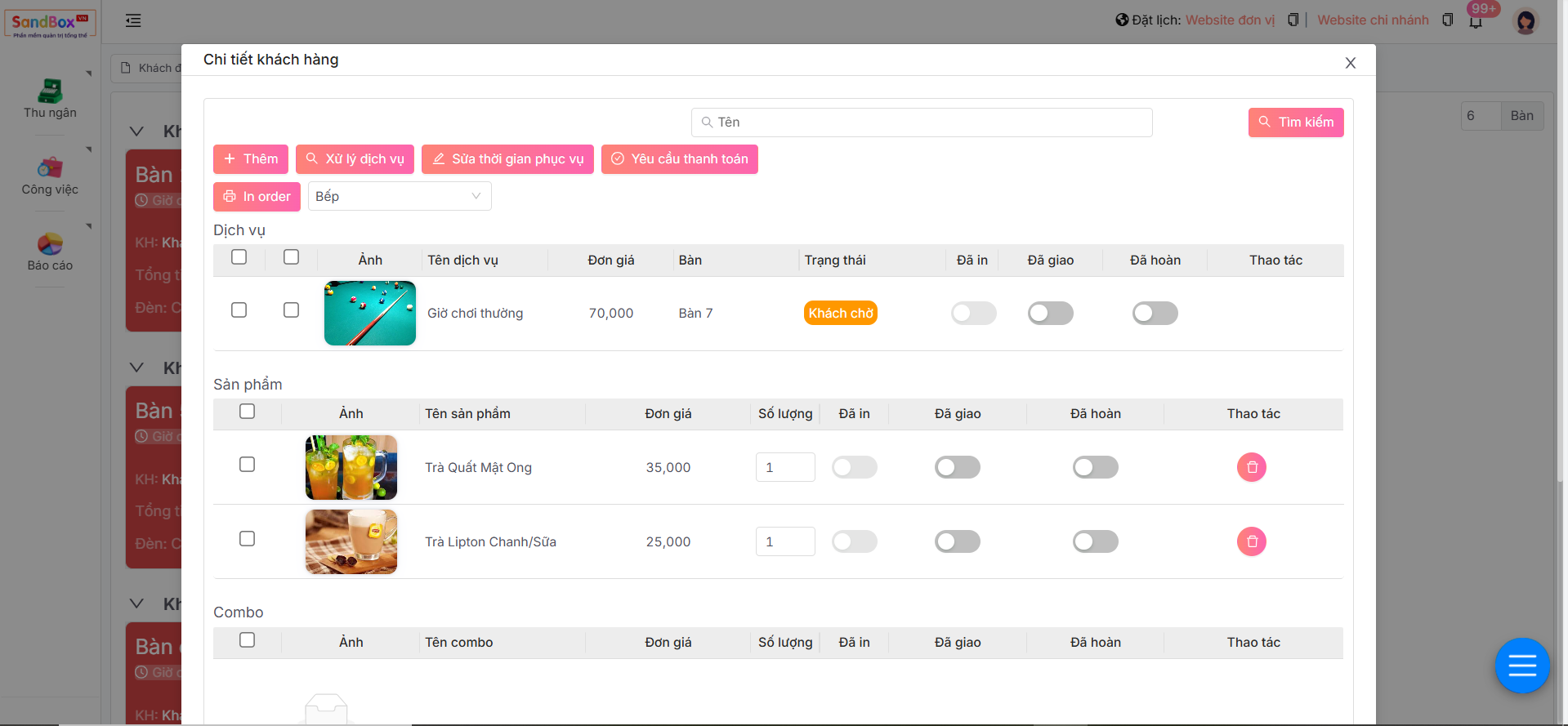 * Ngoài ra, nhân viên có thể thực hiện thao tác gộp bàn hoặc thực hiện chỉnh sửa các thông tin trong mục **Chi tiết khách hàng** sau khi mở bàn