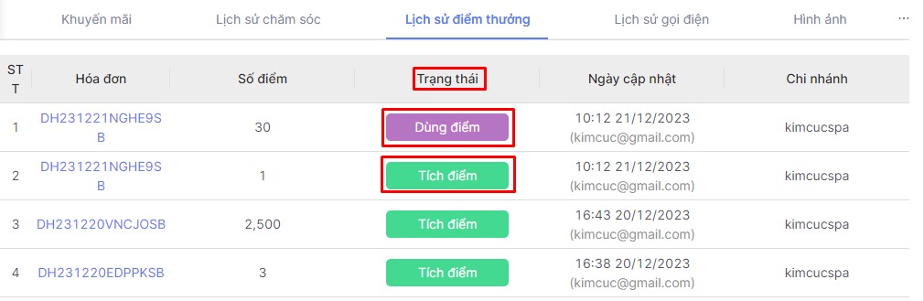 Tab Lịch sử điểm thưởng: hiển thị lịch sử điểm thưởng khách hàng nhận được sau khi thanh toán các đơn hàng thành công tại thu ngân và cả lịch sử dùng điểm để thanh toán của khách.