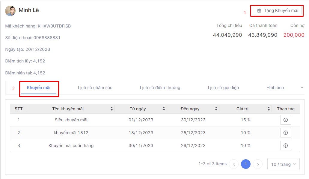 Tặng khuyến mãi (1): nhấn vào "Tặng khuyến mãi" để mở popup tặng khuyến mãi cho khách