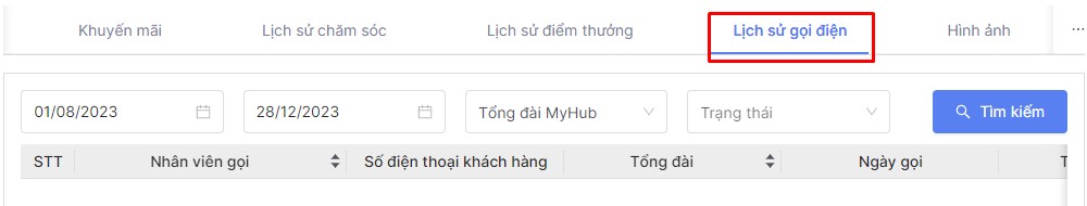 Tab Lịch sử gọi điện: hiển thị lịch sử gọi điện của nhân viên cửa hàng với khách hàng.