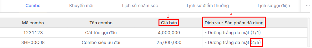 Dịch vụ - Sản phẩm đã dùng (2): số lần còn lại của combo sau khi sử dụng.