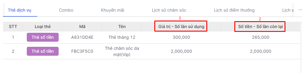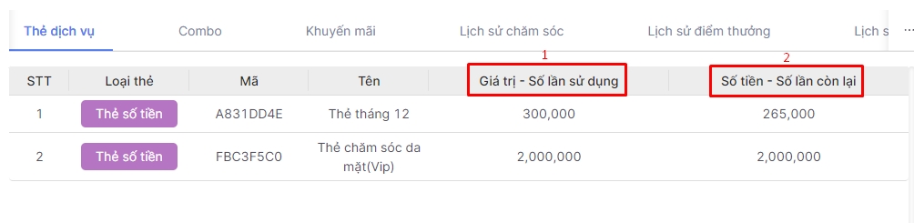 Số tiền - Số lần còn lại (2): hiển thị số tiền còn lại của thẻ sau khi khách đã dùng thẻ để thanh toán cho các đơn hàng ở thu ngân.