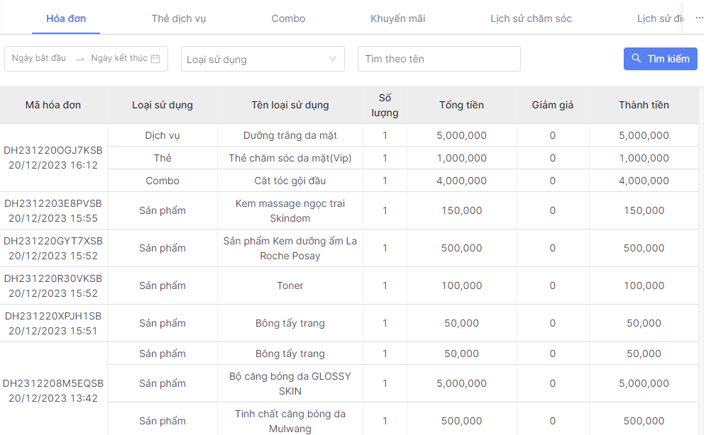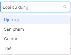 Tìm kiếm theo loại sử dụng: anh/chị cũng có thể lọc bằng cách chọn dịch vụ, sản phẩm, combo hoặc thẻ mà khách đã mua.