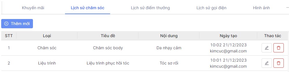 Tab Lịch sủ chăm sóc: nơi nhân viên lưu lại lịch sử chăm sóc hoặc các liệu trình của khách.