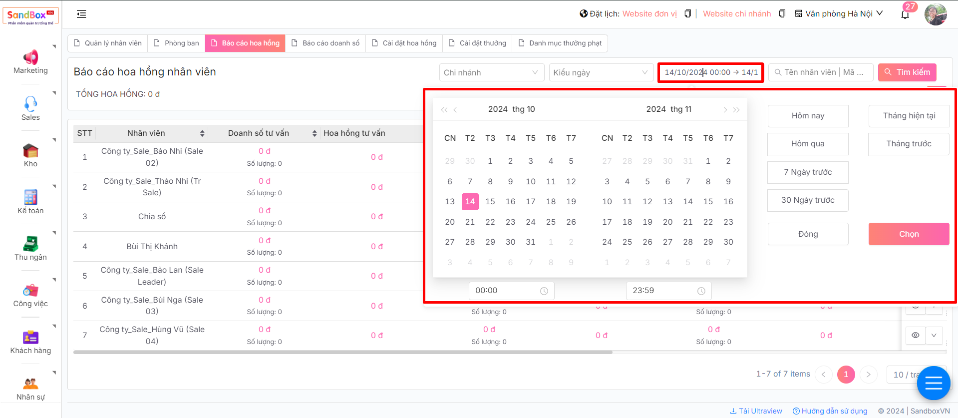 4. Xem [Báo cáo theo chi tiết đơn hàng](https://docs.sandbox.com.vn/8.-nhan-su/8.2-quan-ly-nhan-vien/8.2.3-bao-cao-hoa-hong/bao-cao-theo-chi-tiet-don-hang)