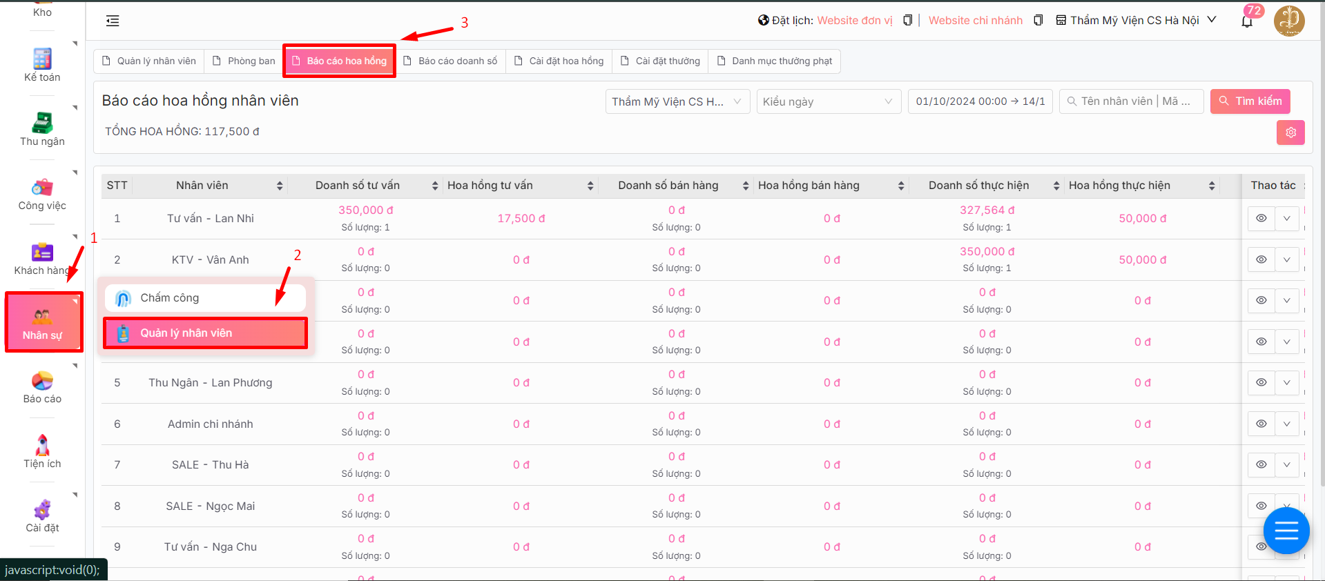 1. Sau khi đăng nhập thành công, tại thanh menu chọn **Nhân sự** -> **Quản lý nhân viên** -> chọn tab **Báo cáo hoa hồng**