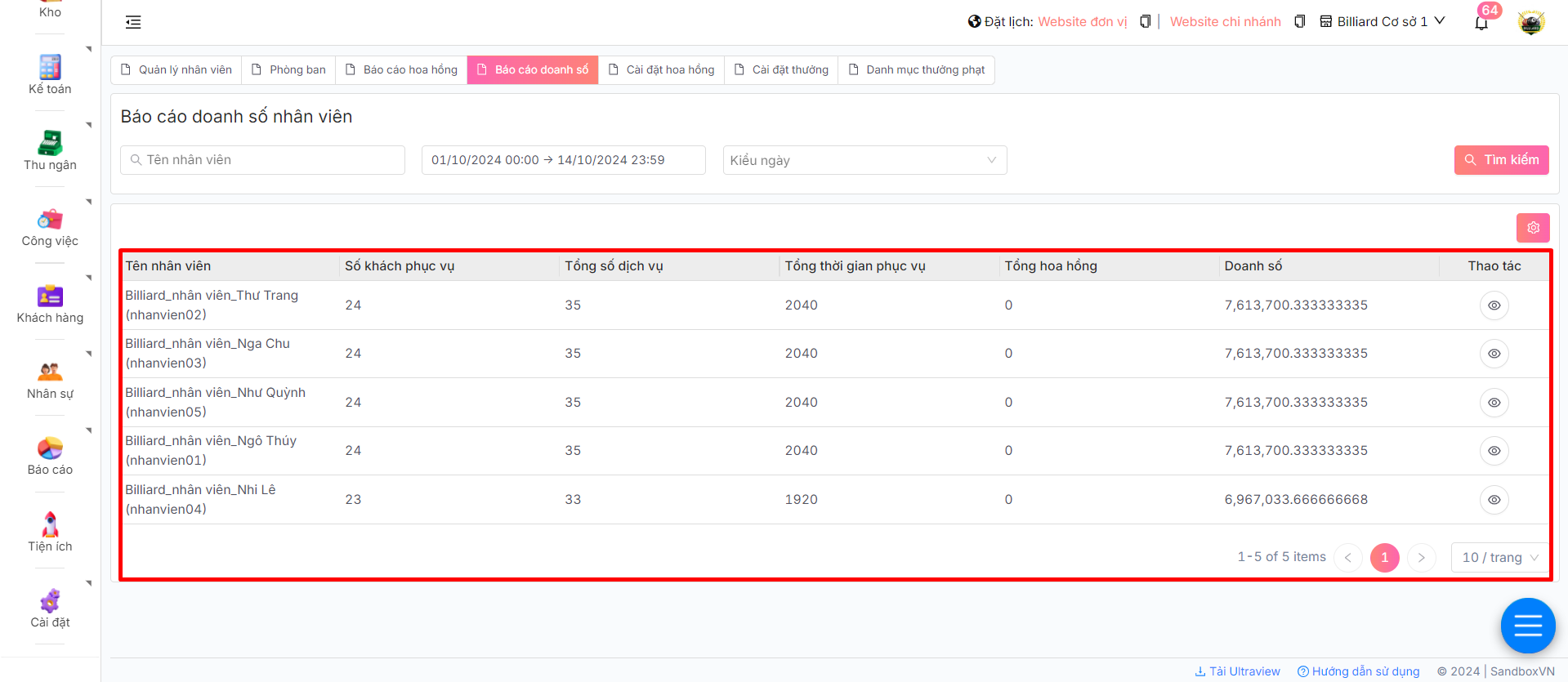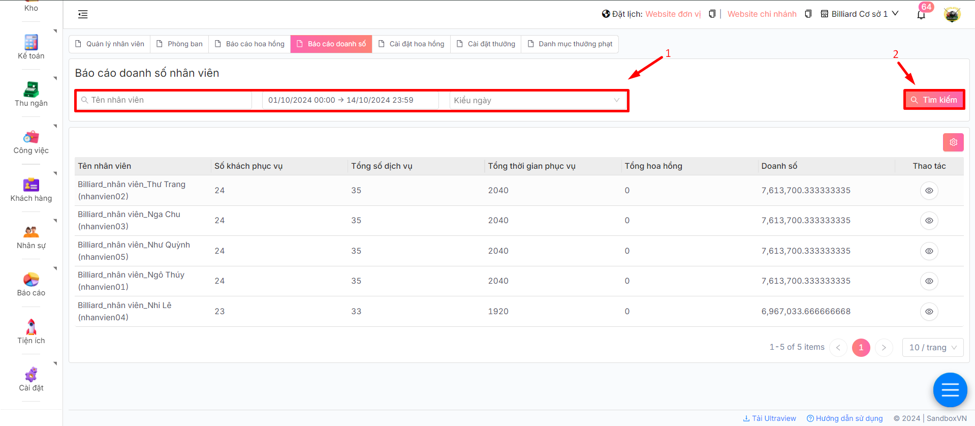 2. Tại đây, anh/chị có thể theo dõi báo cáo doanh số của từng nhân viên trong một khoảng thời gian cụ thể
