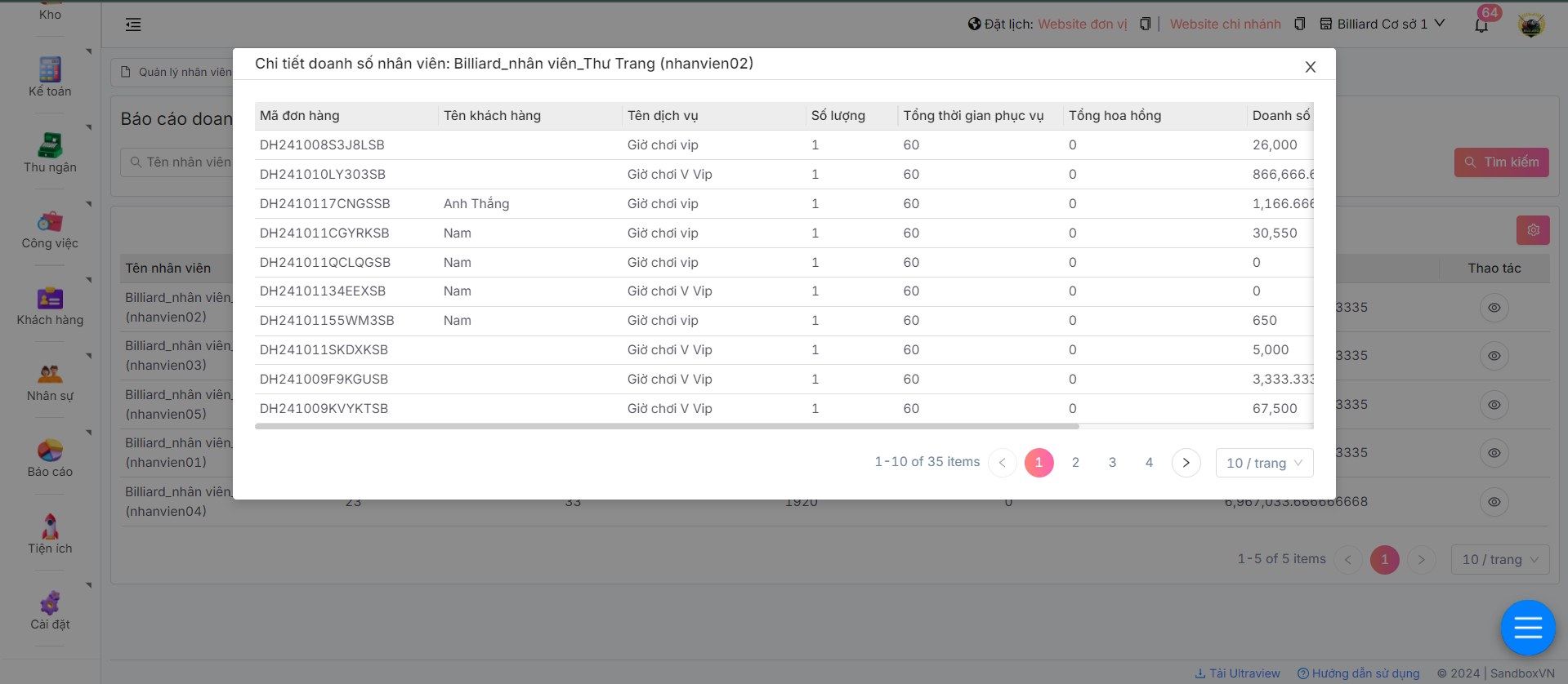 Hệ thống sẽ hiển thị chi tiết doanh số của nhân viên muốn xem thống kê theo từng đơn hàng