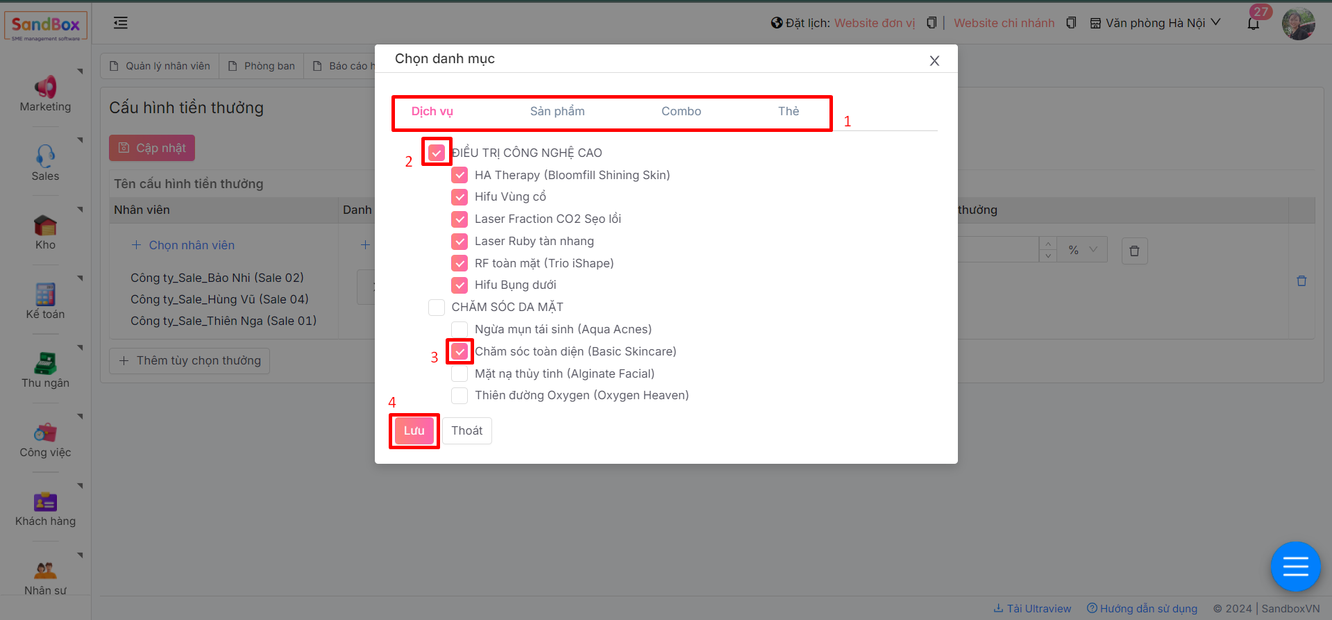 * Bước 1: Tích vào tên nhóm để chọn nhanh tất cả các dịch vụ trong nhóm đó (2) hoặc tích vào từng tên dịch vụ áp dụng thưởng (3)