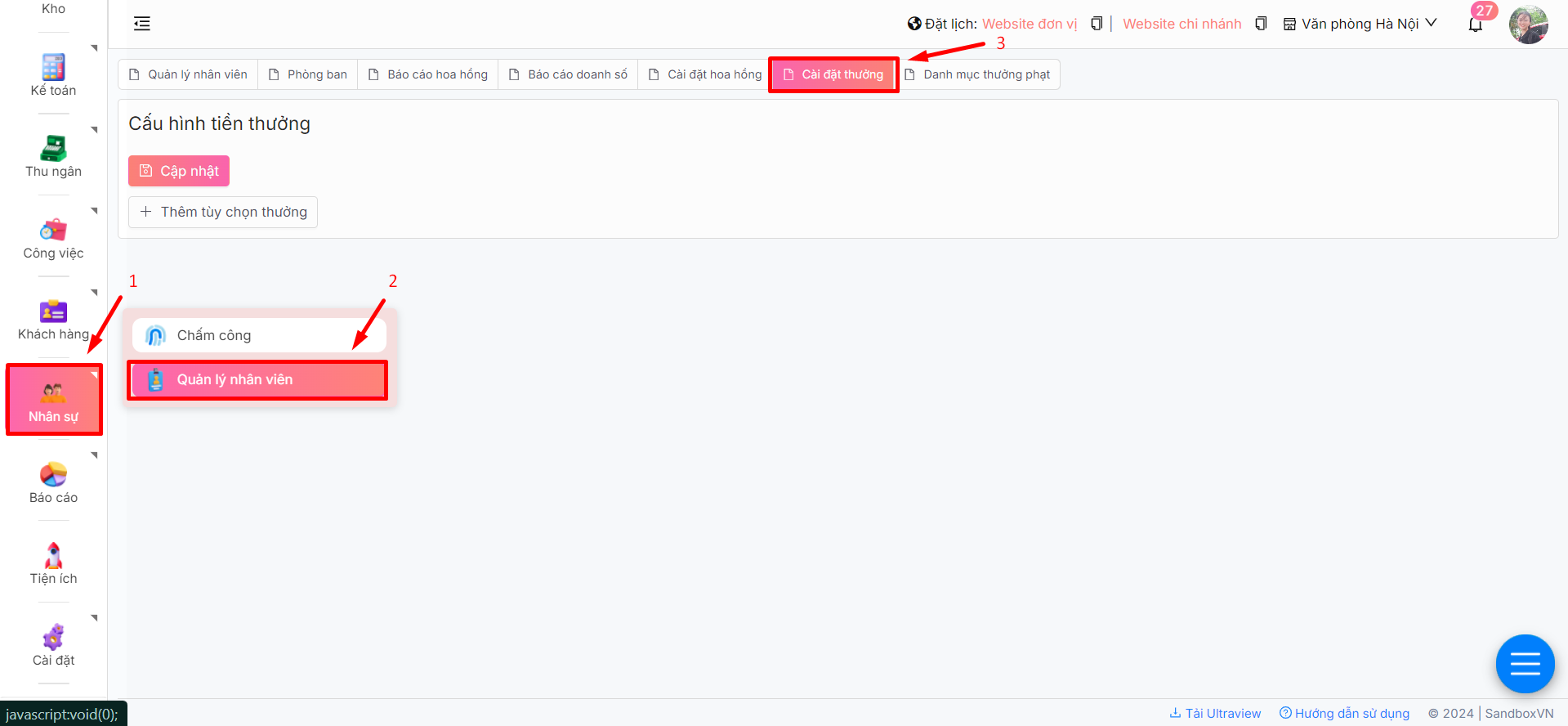 1. Sau khi đăng nhập thành công, tại thanh menu chọn **Nhân sự -> Quản lý nhân viên ->** Chọn mục **Cài đặt thưởng**