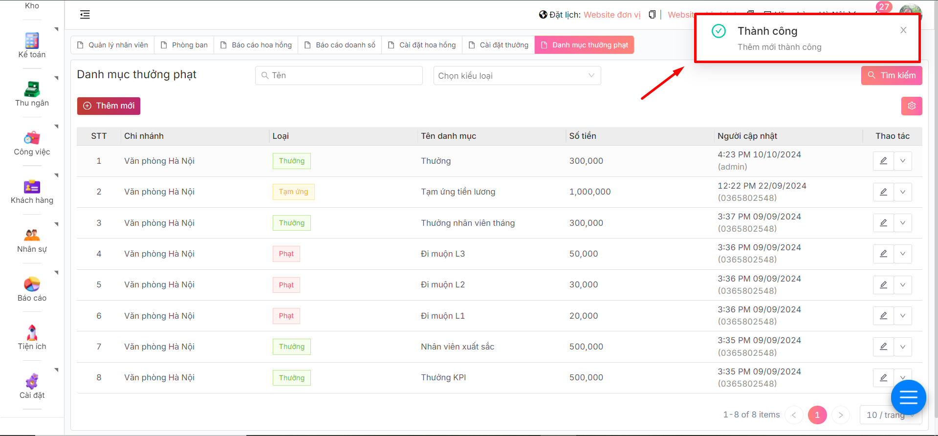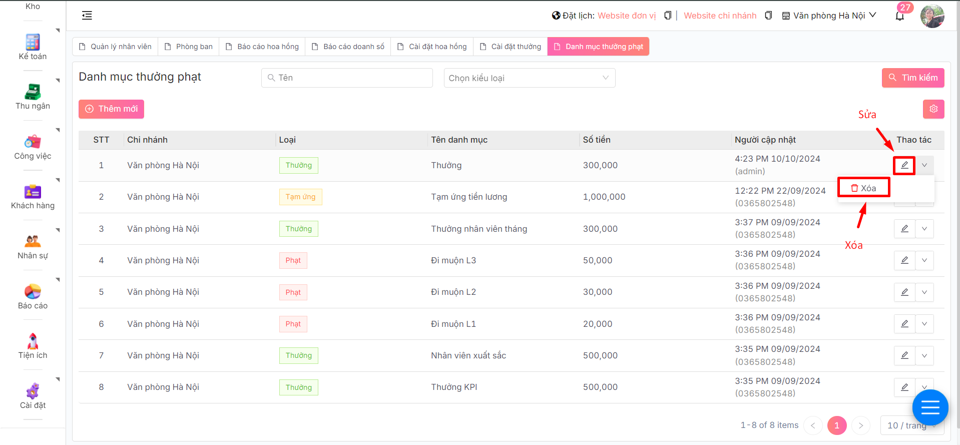 3. Sau khi tạo danh mục thưởng phạt, bạn có thể **Xóa** hoặc **Chỉnh sửa** để đảm bảo tính chính xác của thông tin.