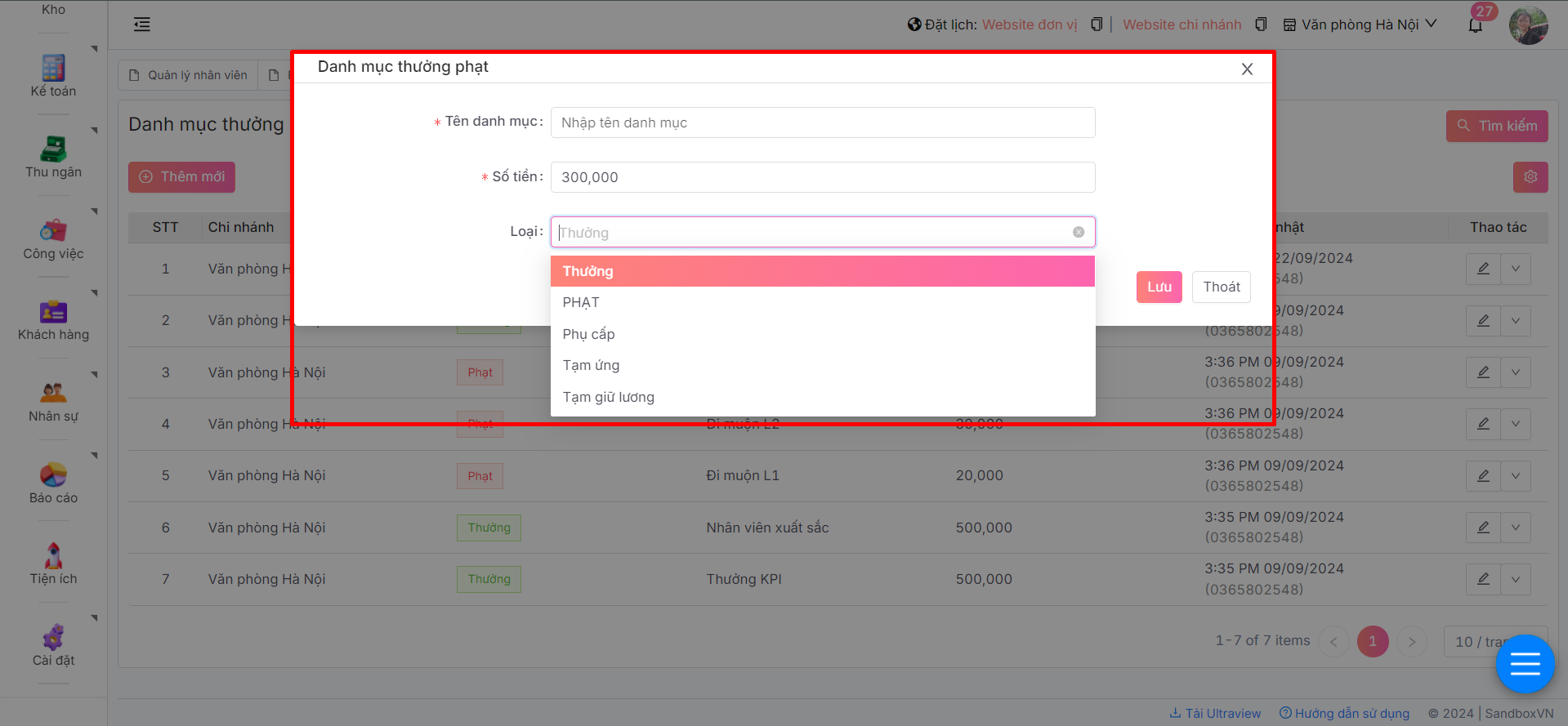 2. Để tạo danh mục mới, bạn ấn <img src="https://46536393-files.gitbook.io/~/files/v0/b/gitbook-x-prod.appspot.com/o/spaces%2FKnaMljuquxKOnflZEqLy%2Fuploads%2Ff5nR2vvgJgdN5ZtbgQSV%2Fimage.png?alt=media&#x26;token=3cb5640a-980b-4f1d-b87e-c57891662bfc" alt="" data-size="line"> -> Hiển thị form **Danh mục thưởng phạt**, bạn nhập đầy đủ các thông tin của danh mục.