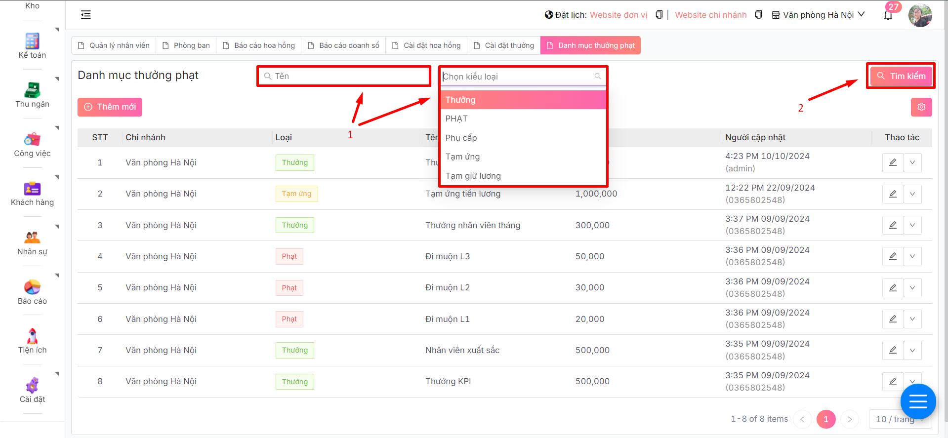 * Số tiền: Nhập giá trị tương ứng với các kiểu thưởng phạt.