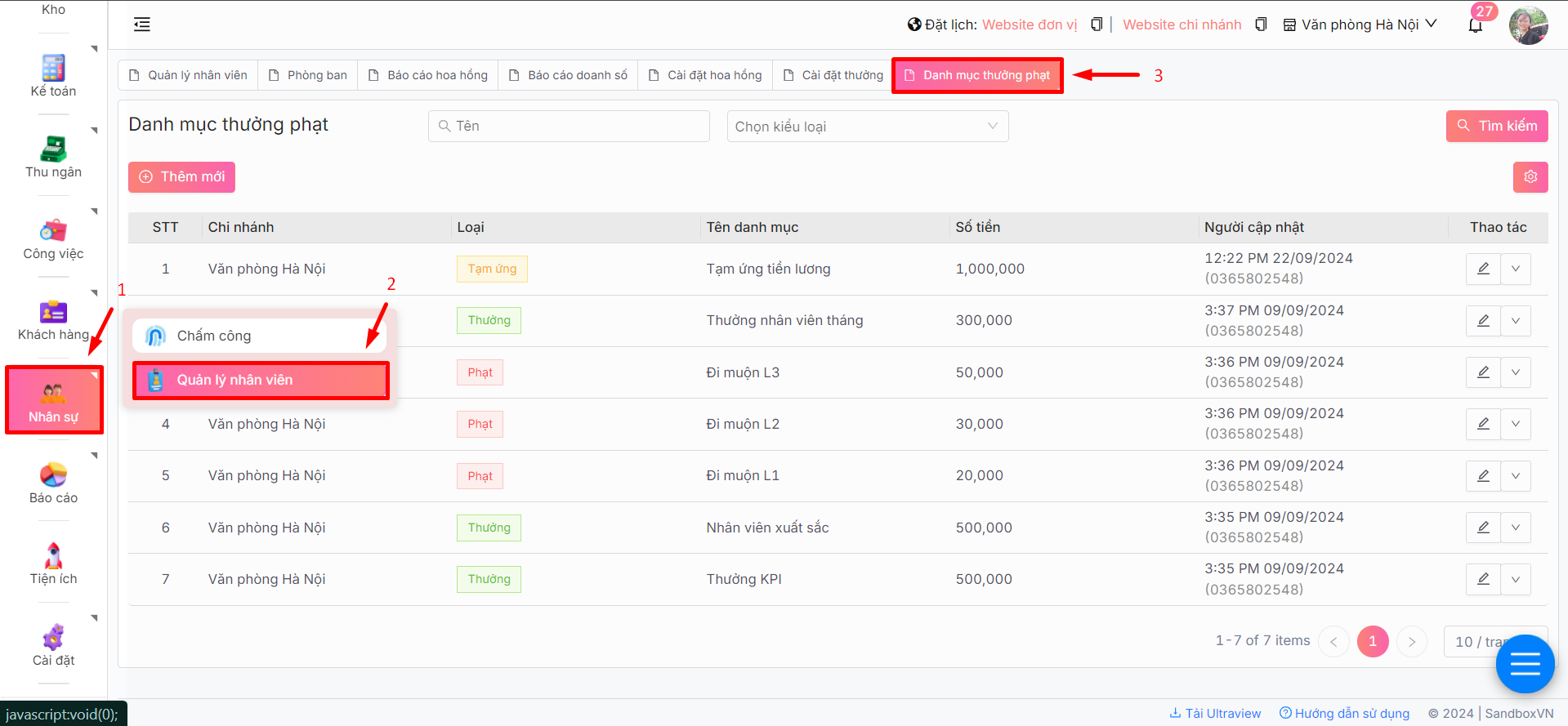 1. Sau khi đăng nhập thành công, tại thanh menu chọn **Nhân sự** -> **Quản lý nhân viên** -> **Danh mục thưởng phạt**
